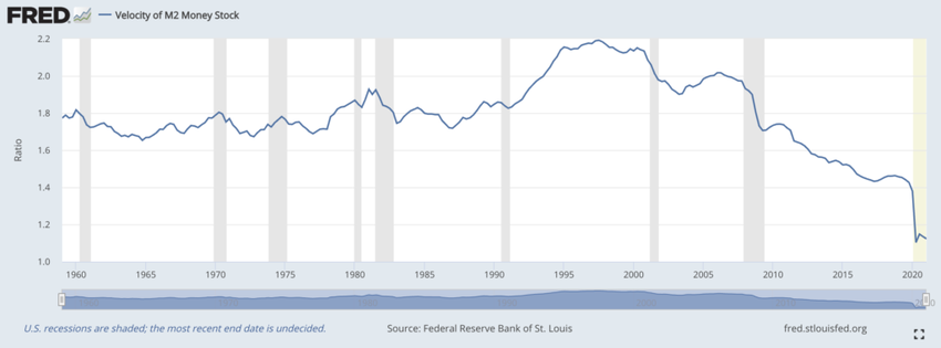 Die Inflation ist im Moment kein wirkliches Problem und könnte einfach nur vorübergehend sein. Trotzdem ist die Erhöhung der Geldmenge eine Tatsache. Aber Inflation tritt nicht immer auf, wenn die Geldmenge erhöht wird, da andere Effekte dem entgegenwirken, wie z. B. die Geschwindigkeit des Geldes.