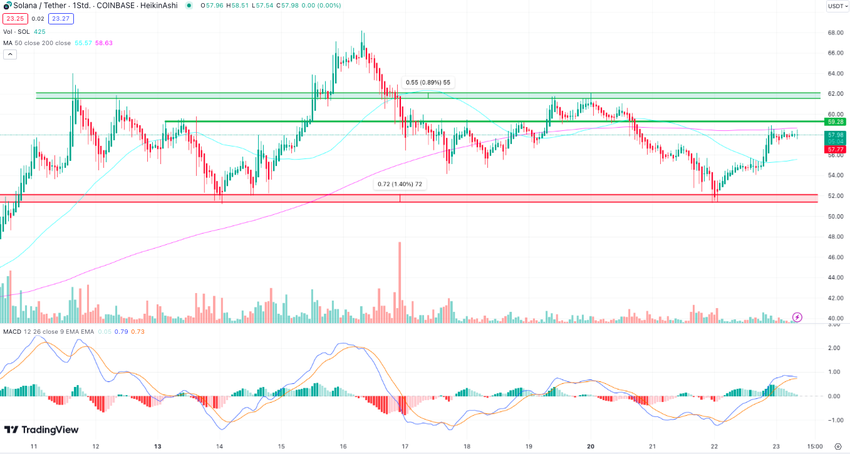 Nun befindet sich der Solana Kurs bereits über einem langfristigen charttechnischen Widerstand, den der Krypto-Analyst Bill Noble identifiziert hat. Sollte Solana nachhaltig über 58,32 $ ausbrechen und hier die Trendlinie überwinden, wäre das Setup demnach bullisch. Denn zunächst würde die charttechnische Kopf-Schulter-Formation invalide werden. Zugleich würde es ein Ausbruchsziel bei 78 $ geben, sodass der Solana Kurs kurzfristig mehr als 30 % Potenzial hat.