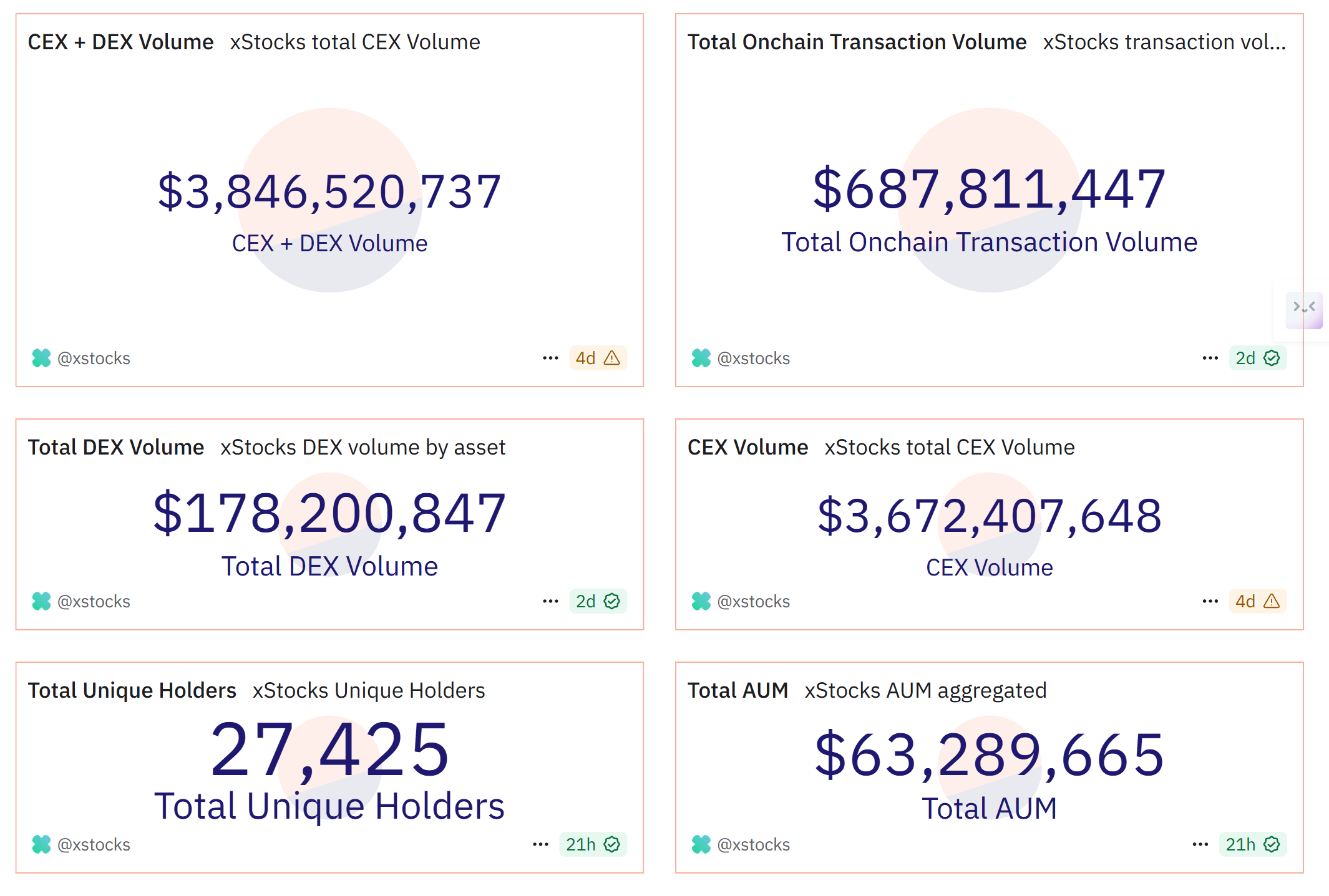 Die US-Börse Kraken führte xStocks im Juni in Zusammenarbeit mit dem Tokenisierungsunternehmen Backed ein. Seitdem verzeichnete das Produkt laut Dune Analytics ein Handelsvolumen von mehr als 3,84 Milliarden USD.