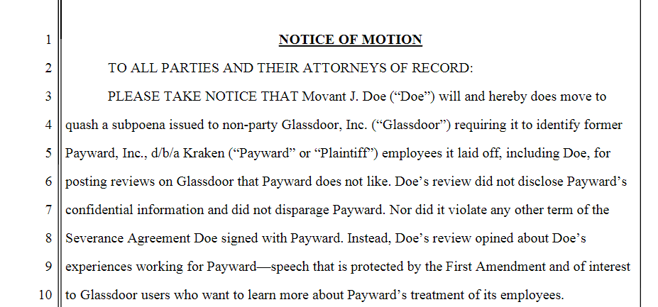 SponsoredGlassdoor ist eine Plattform, auf der Mitarbeiter verschiedene Aspekte der Arbeit in einem Unternehmen bewerten können. Dadurch ist Paywards Vorladung ein Versuch, herauszufinden, welche der ehemaligen Mitarbeiter für die negativen Bewertungen über Kraken verantwortlich waren.