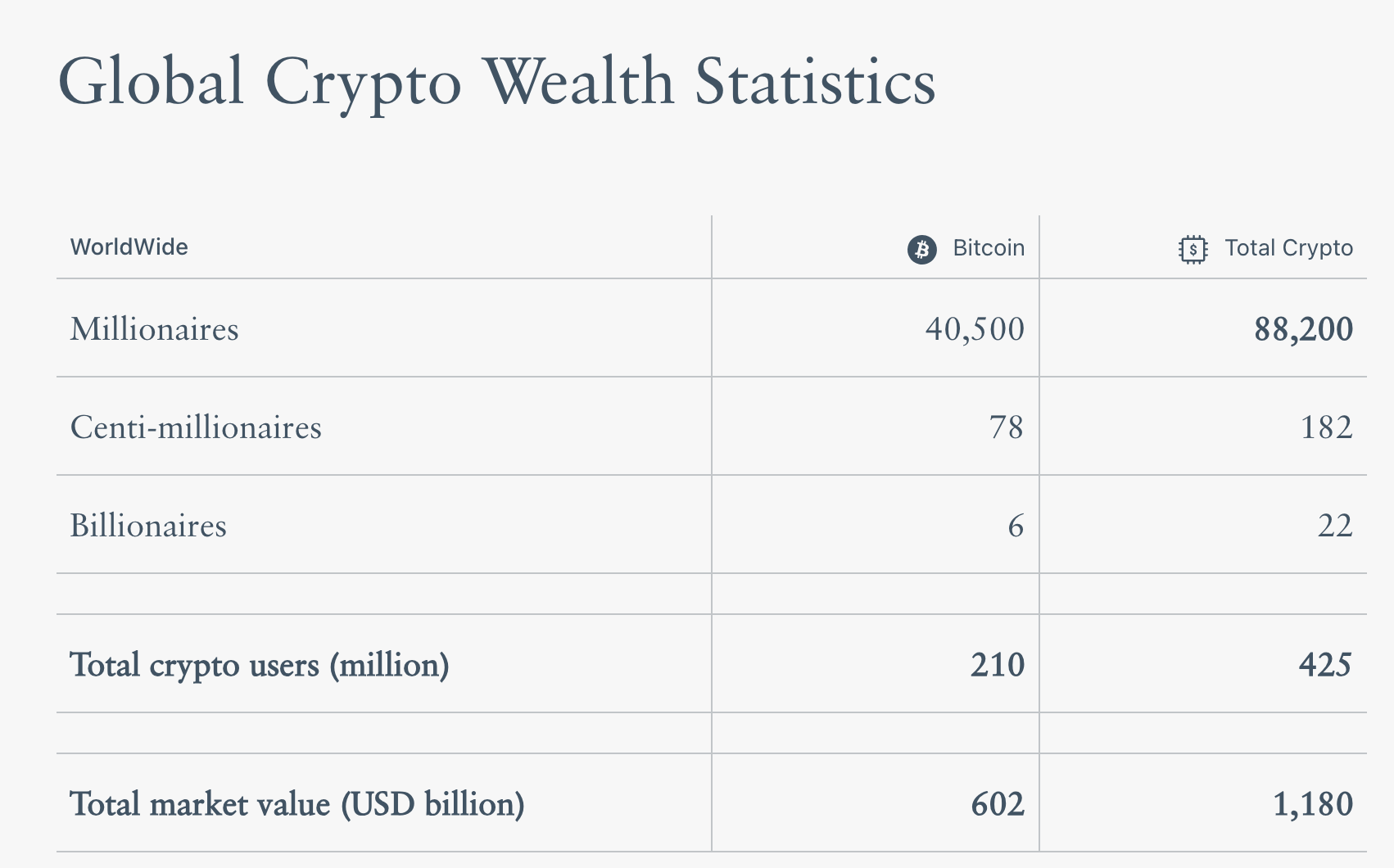 Dabei bleibt die Vorherrschaft von Bitcoin weiterhin unbestritten: von den 88.200 Krypto-Millionären verdanken 40.500 ihren Wohlstand ausschließlich dem größten digitalen Vermögenswert.