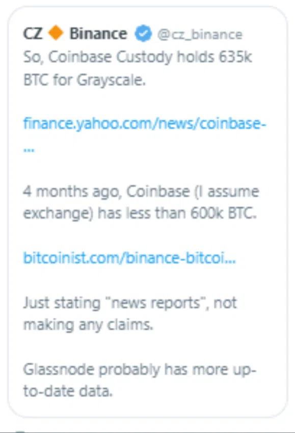 CZ verwies in seinem Tweet zunächst auf die Angaben des Coinbase Custody CEO, Aaron Schnarch, welchen zufolge das Unternehmen über 635.000 BTC im Namen des Grayscale Bitcoin Trust (GBTC) verfüge. Darauffolgend griff der Binance CEO eine zweite, vier Monate alte Meldung von Coinbase auf, laut welcher die Börse weniger als 600.000 BTC halte.
