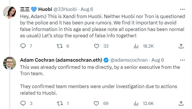 Die ersten Gerüchte über Verhaftungen chinesischer Behörden im Zusammenhang mit Glücksspielplattformen tauchten am 4. August auf. Weiterhin gibt es Bedenken bezüglich der Zahlungsfähigkeit der Exchange. Fintech-Manager und Angel-Investor Adam Cochran wies auf mögliche Inkonsistenzen in den Tether-USDT-Beständen hin, was die Zahlungsunfähigkeit von Huobi zur Folge haben könnte.