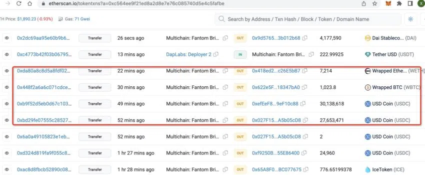 Als Hacker am 7. Juli die Fantom-Bridge von Multichain kompromittierten, konnten sie Kryptowährungen im Wert von 126 Millionen USD erbeuten. Zu den betroffenen Vermögenswerten gehörten WBTC (30,9 Millionen USD), USDC (57 Millionen USD), wETH (13,6 Millionen USD). Darüber hinaus erbeuteten die Angreifer auch DAI und LINK.