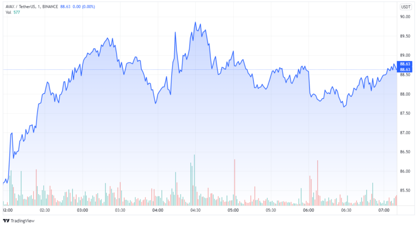 AVAX, der Avalanche-Token, war in der vergangenen Woche einer der Top-Gainer auf dem Markt. Der AVAX Kurs stieg in diesem Zeitraum um 27,7% und liegt zum Zeitpunkt der Veröffentlichung dieses Artikels bei ca. 88 USD.