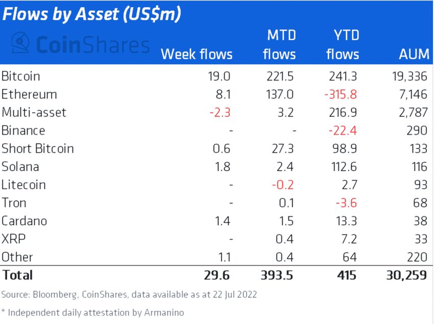 SponsoredCoinShares zufolge summierte sich der gesamte Kapitalzufluss seit Anfang des Monats auf insgesamt 394 Millionen US-Dollar. Der Gesamtwert der gemanagten Krypto-Assets liegt mit 30 Milliarden US-Dollar außerdem wieder auf dem Niveau von Anfang Juni 2022.