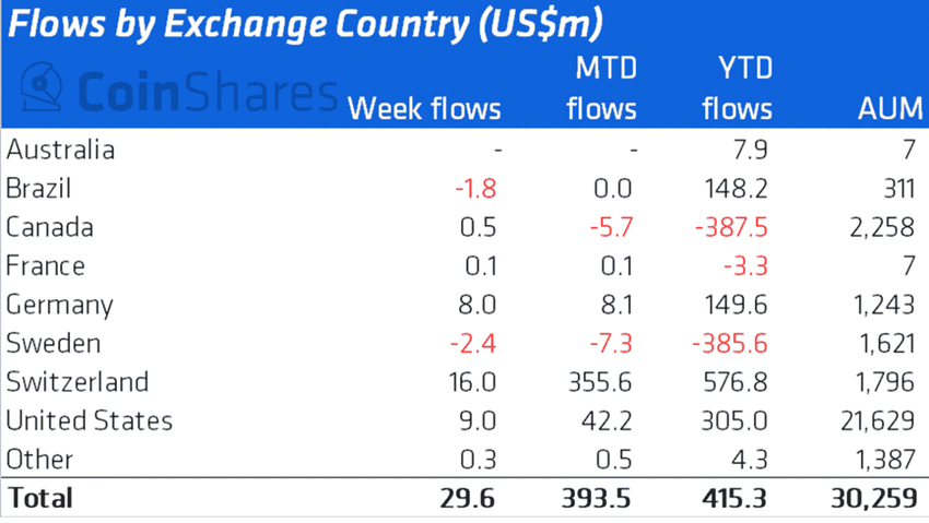 Dem Bericht von CoinShares zufolge kam das meiste zugeflossene Kapital der letzten Wochen aus der Schweiz.