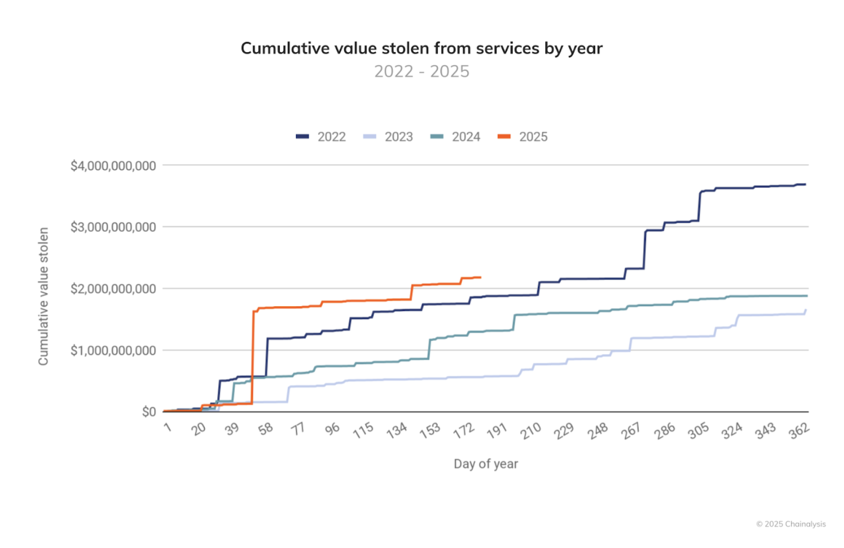 Im krassen Gegensatz dazu erreichte 2025 ähnliche Werte in nur 142 Tagen. Ende Juni 2025 war der gestohlene Wert im Jahresvergleich (YTD) um 17 Prozent höher als 2022.