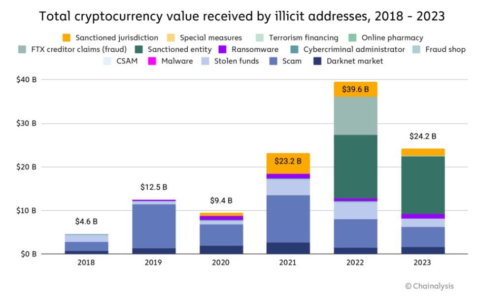 Das Unternehmen berichtete, dass 2023 ein signifikanter Rückgang des von illegalen Kryptowährungsadressen erhaltenen Wertes auf insgesamt 24,2 Milliarden US-Dollar zu verzeichnen war. Dies ist ein Rückgang von 39 Prozent gegenüber 2022, in welchem das illegale Transaktionsvolumen 39,6 Milliarden Dollar betrug.