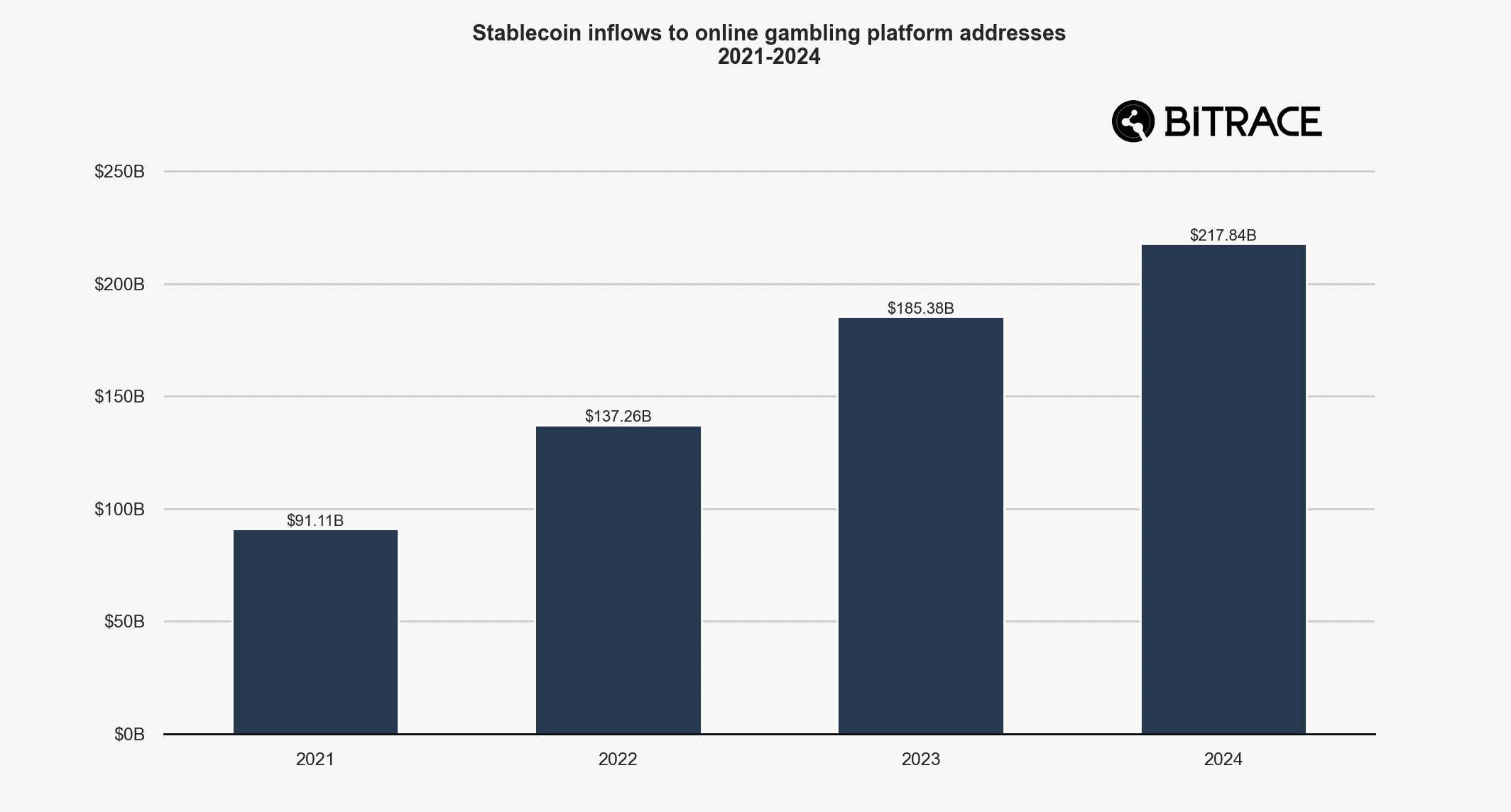 Stablecoins, insbesondere USDT und USDC, sind das bevorzugte Zahlungsmittel für illegale Aktivitäten. Besonders auffällig ist der Anstieg der Transaktionen auf Online-Glücksspielplattformen. Diese Plattformen verzeichneten 2024 insgesamt 217,8 Milliarden USD an Stablecoin-Inflows, was einem Anstieg von 17,5 Prozent im Vergleich zu 2023 entspricht.