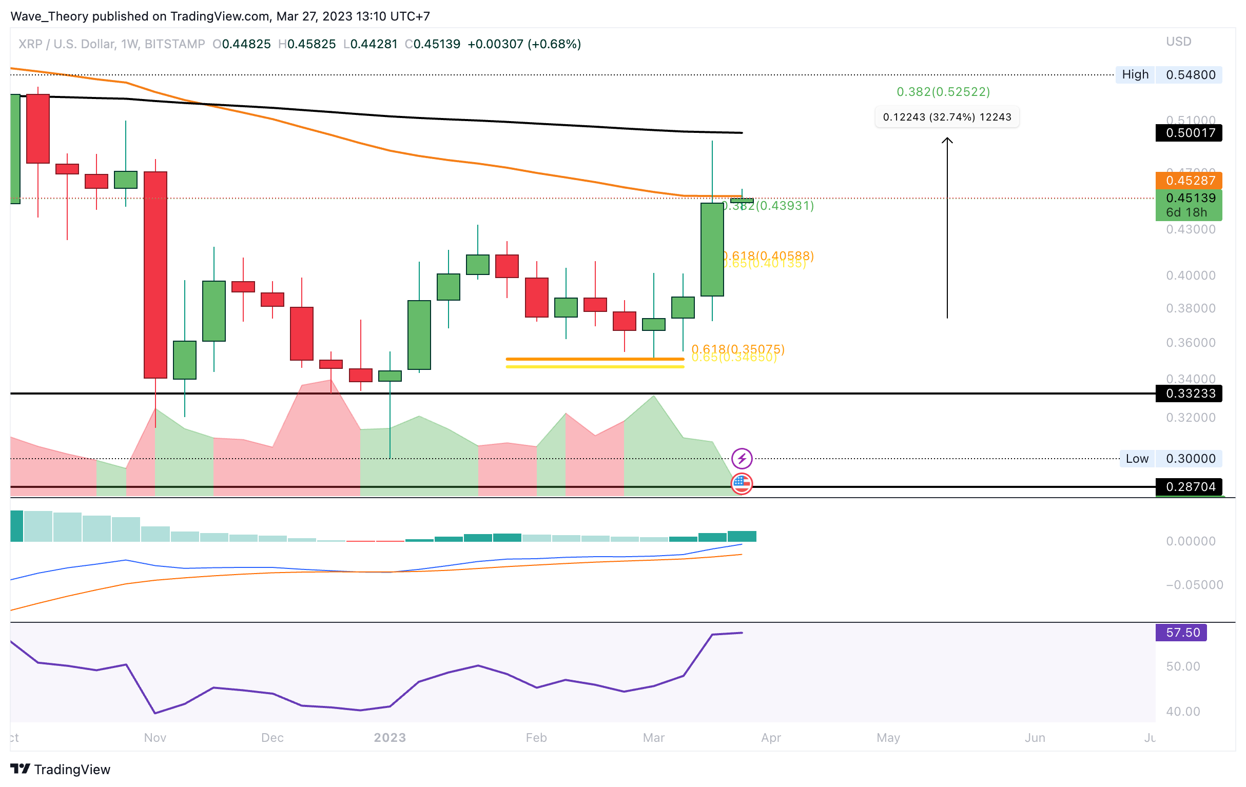 Der Ripple (XRP) Kurs konnte letzte Woche rund 33 % steigen. Damit stößt XRP jetzt auf signifikanten Widerstand am 50-Wochen-EMA bei rund 0,45 USD. Wird XRP bärisch abgewiesen, warten bereits bei rund 0,439 USD und bei rund 0,4 USD signifikante Fib Unterstützungen.