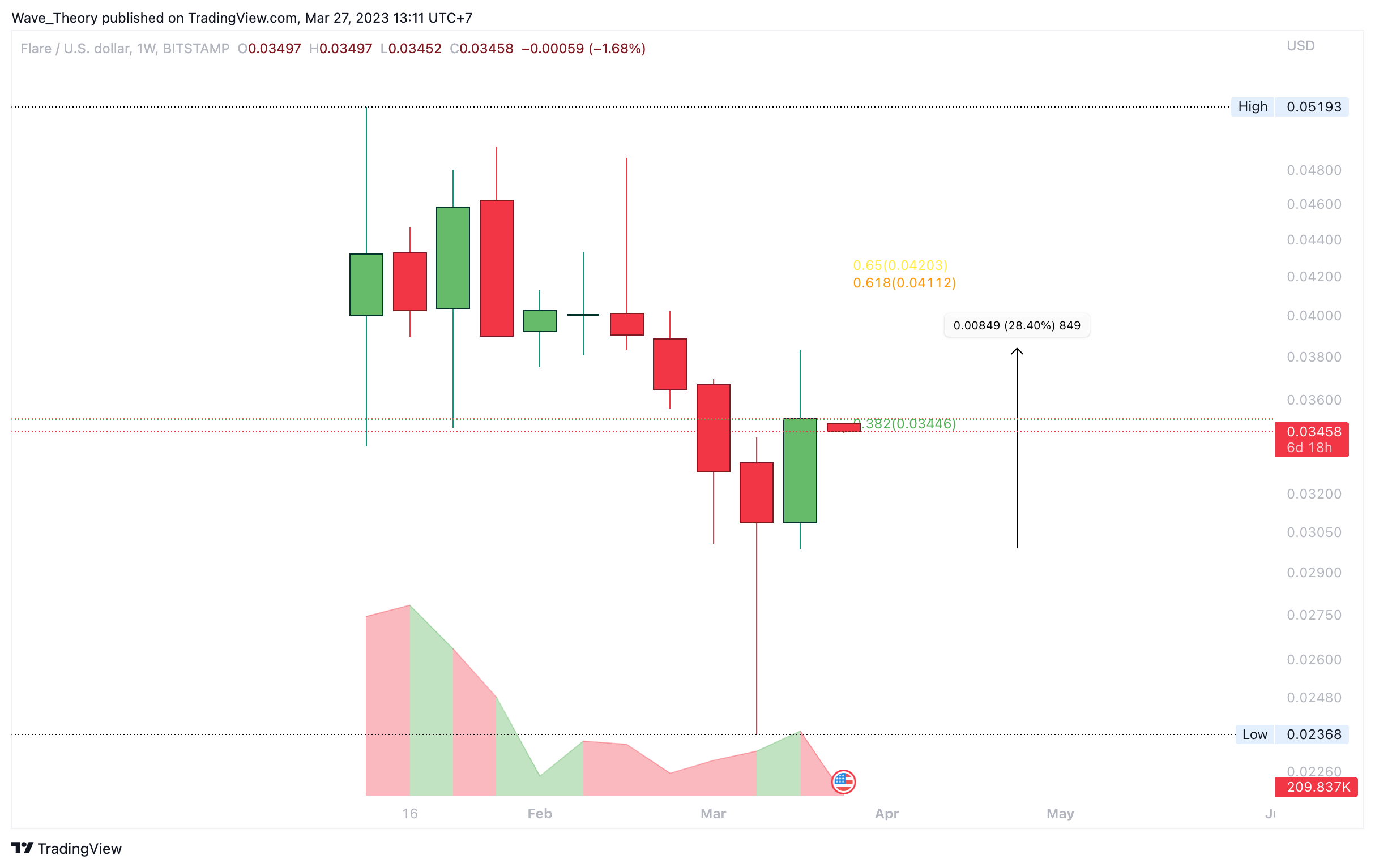 Flare (FLR) konnte letzte Woche rund 28,4 % steigen. Bei rund 0,034 USD und bei rund 0,042 USD stößt Flare jetzt auf signifikante Fib Widerstände.