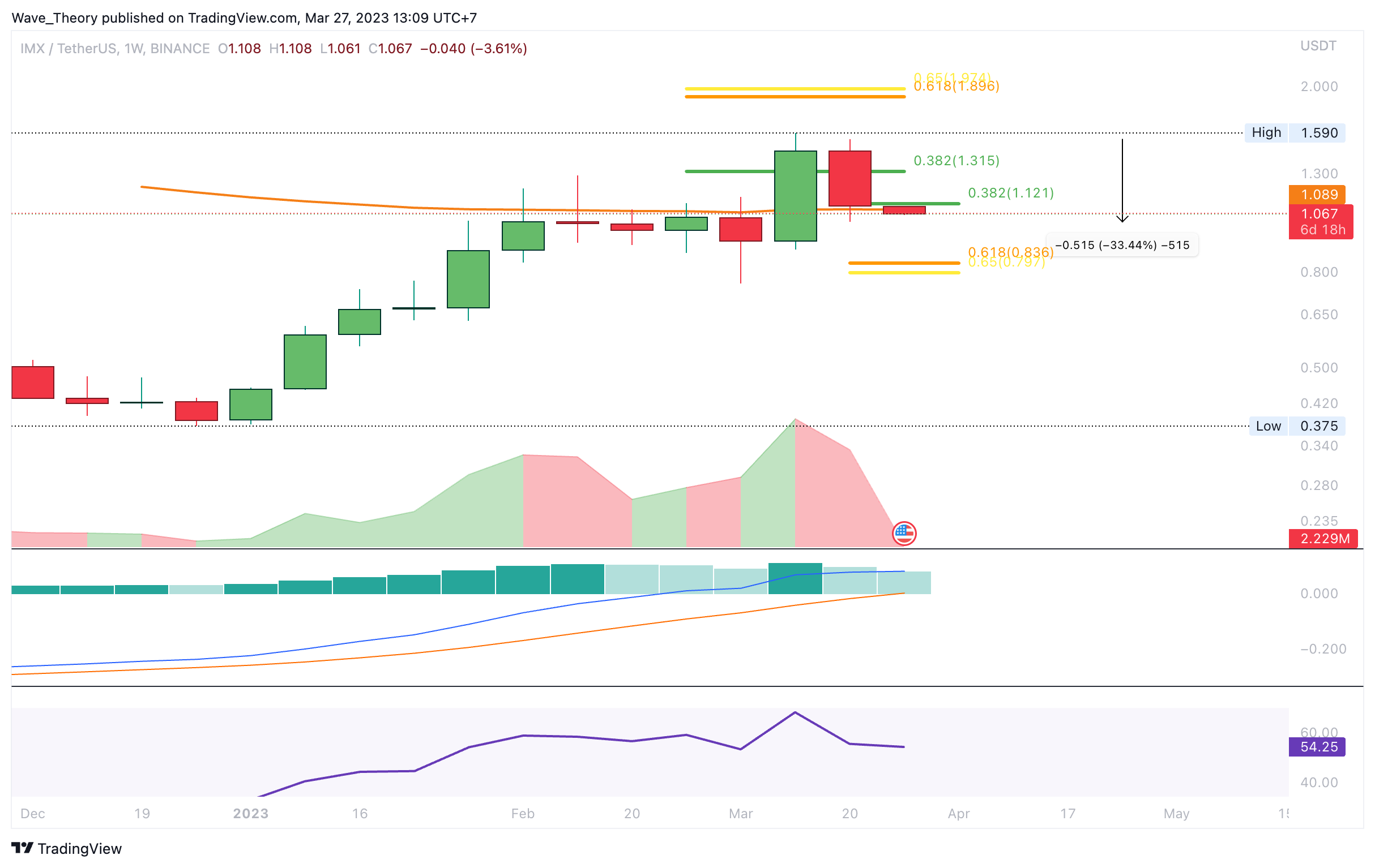 Auch Immutable (IMX) gehörte letzte Woche zu den Top Gewinnern. Doch letzte Woche fiel der Kurs um rund 33,5 %. Damit tickt nun auch das Histogramm des MACDs wieder bärisch tiefer. Aktuell stößt CFX auf signifikante Unterstützung am 50-Wochen-EMA bei rund 1,09 USD. Bricht CFX diese Unterstützung, wartet bei rund 0,83 USD die nächste signifikante Fib Unterstützung.