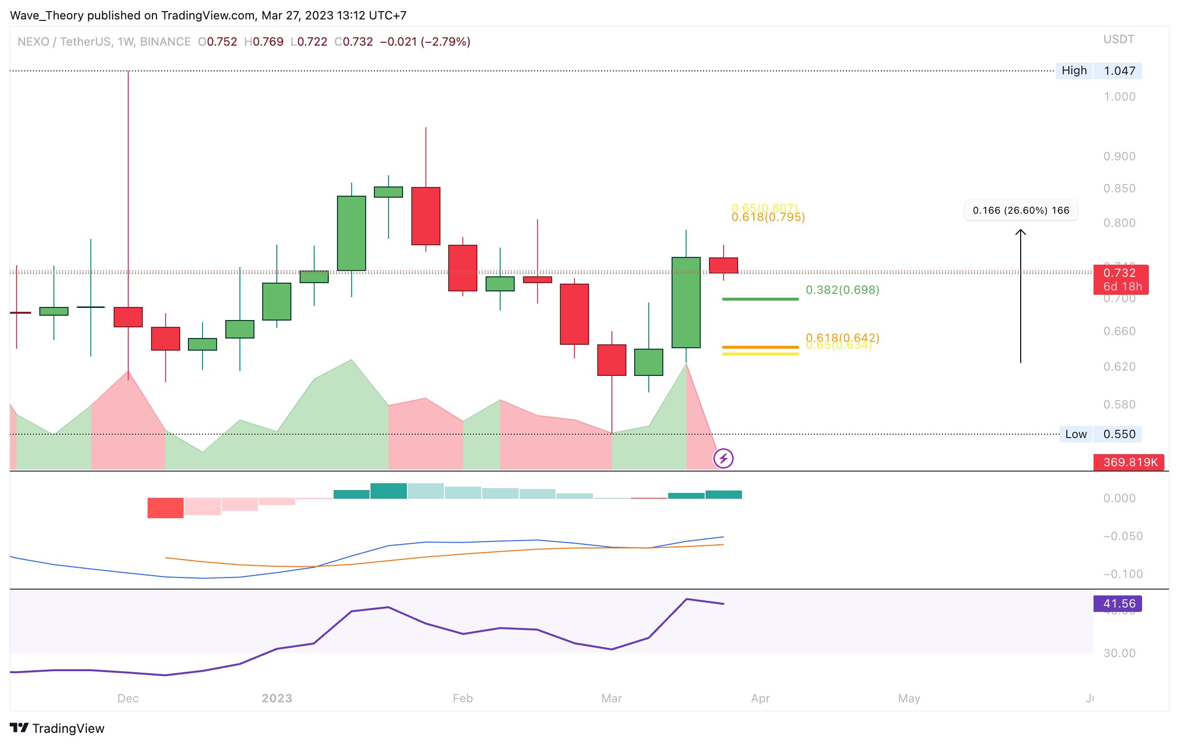 Der Nexo (NEXO) Token konnte letzte Woche rund 26,6 % in die Höhe schießen. Damit wartet jetzt bei rund 0,8 USD der nächste signifikante Fib Widerstand. Darüber hinaus tickt das Histogramm des MACDs im Wochenchart bullisch höher und auch die MACD Linien sind bullisch überkreuzt. Der RSI gibt dabei weder bullische noch bärische Signale.