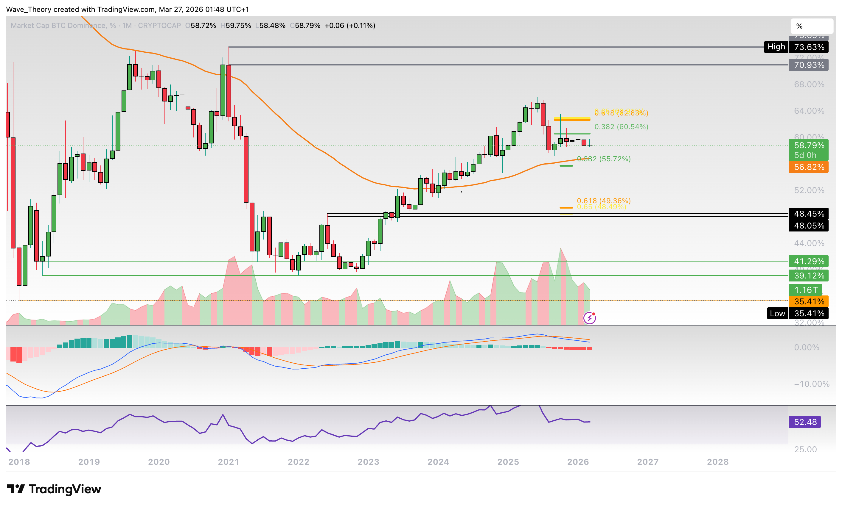Damit verharrt die Dominanz insgesamt in einer stabilen Seitwärtsphase. Im aktuellen Monat zeigt sich jedoch wieder zunehmende Stärke, wodurch ein erneuter Anlauf in Richtung des Widerstands bei 60,5 Prozent wahrscheinlich wird.