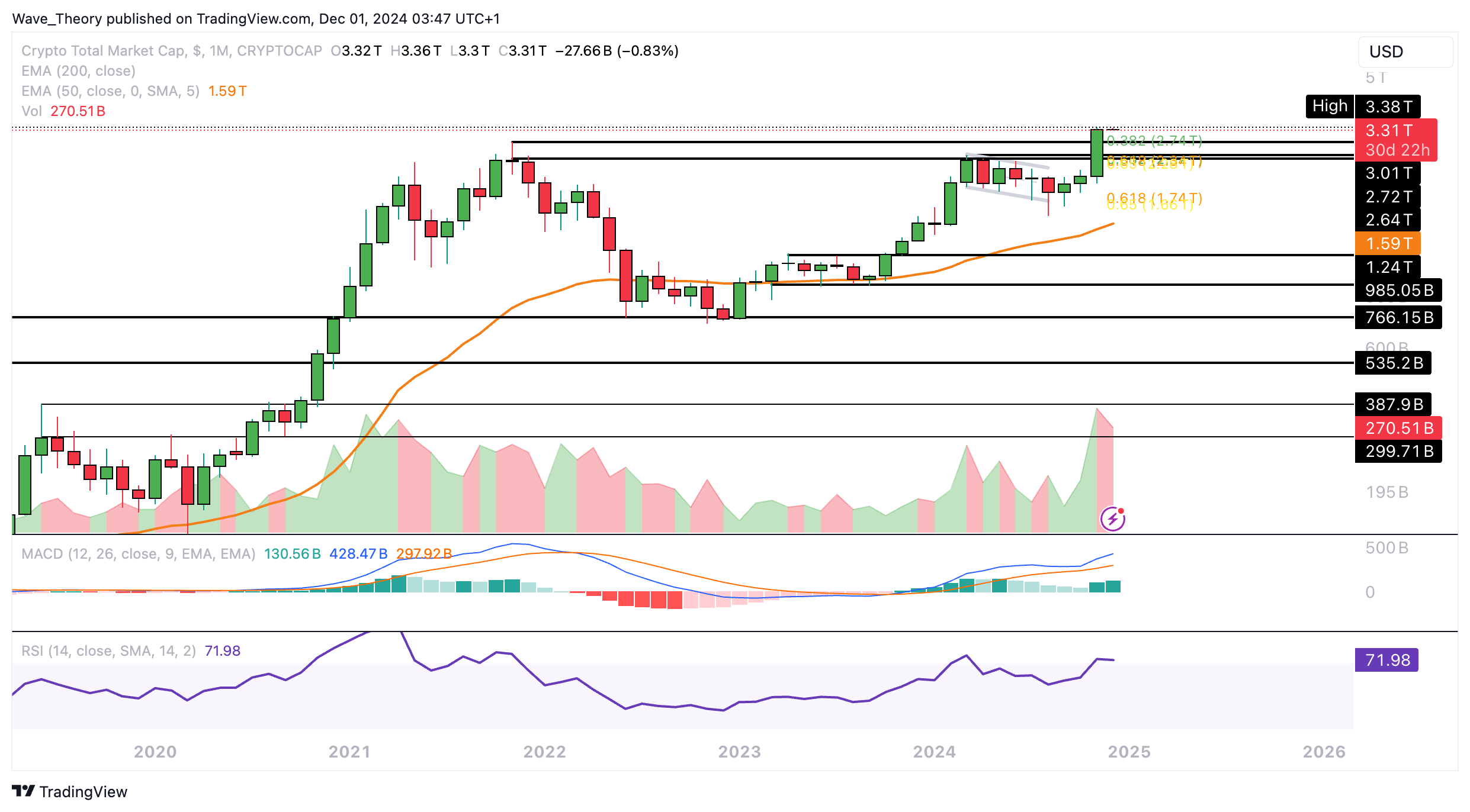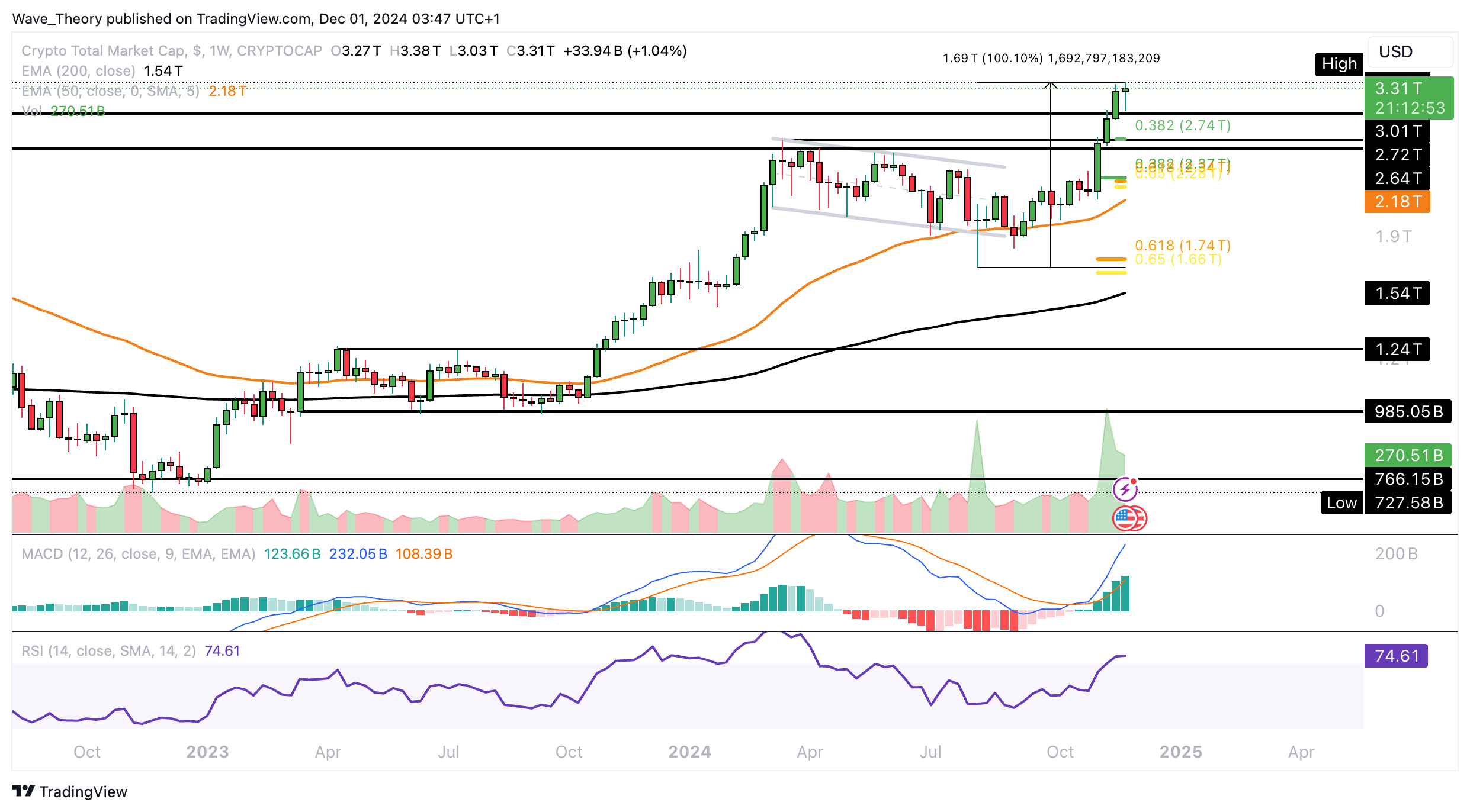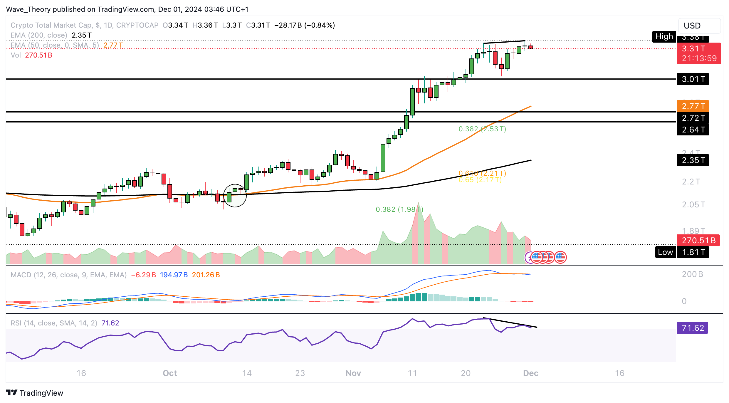 Spätestens aber bei rund 2,53 Billionen USD und 2,2 Billionen USD stößt der Markt auf signifikante Fibonacci Unterstützungen. Davon abgesehen gibt auch der MACD bärische Signale.