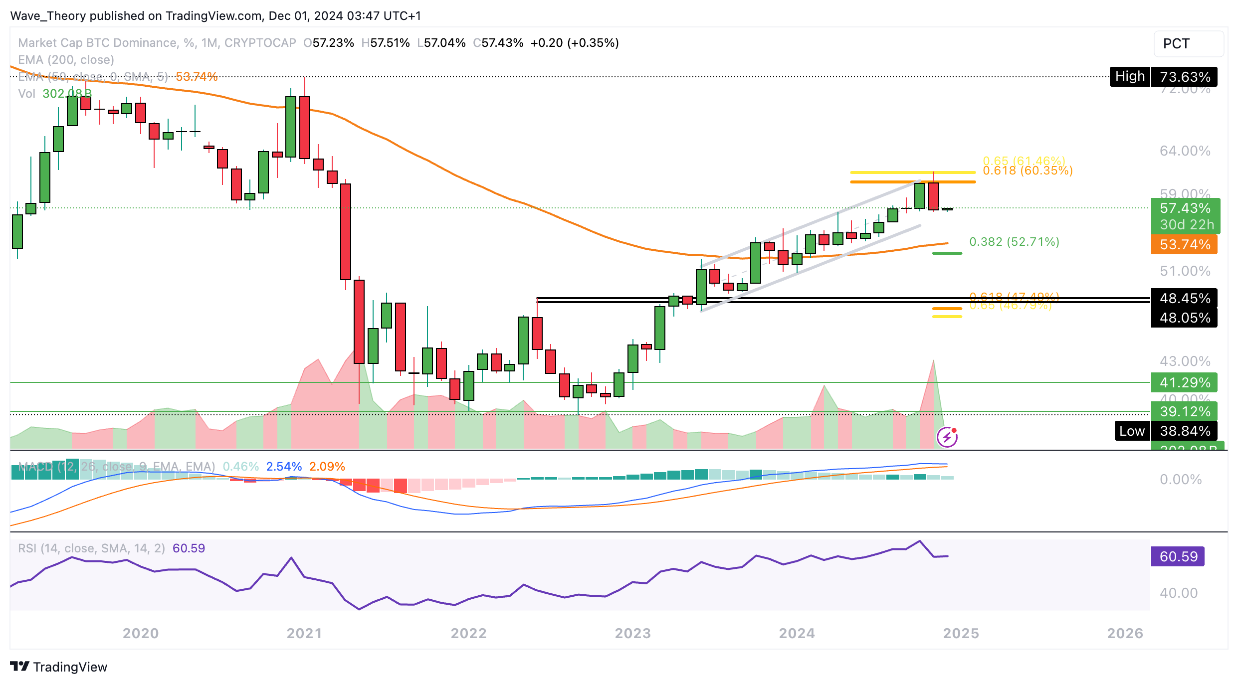 Die Bitcoin Dominanz stößt jetzt am Golden Ratio Niveau bei rund 60,5 % auf bärische Ablehnung. Damit wartet am 50-Monate-EMA bei rund 53,74 % die nächste signifikante Unterstützung.