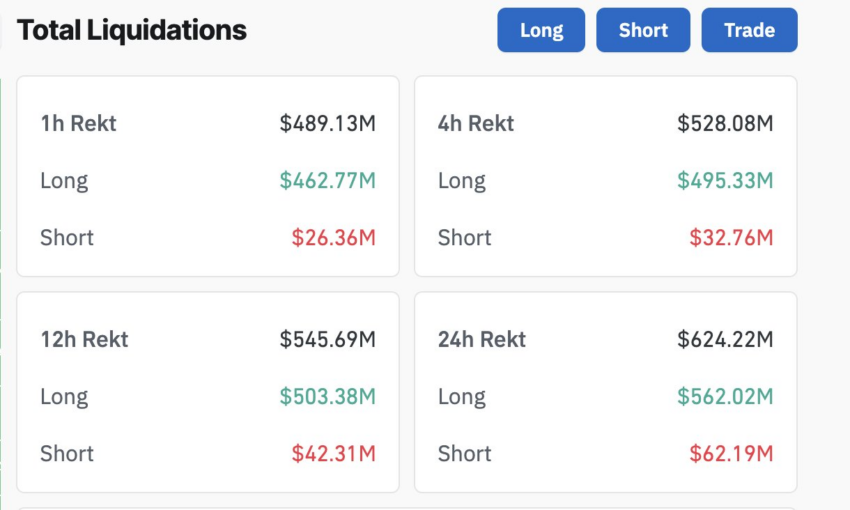 Der untenstehende Screenshot zeigt, dass in der letzten Stunde Krypto-Positionen im Wert von fast 500 Millionen Dollar liquidiert worden sind. Dazu gehören 462 Millionen Dollar an Long-Positionen und 26 Millionen Dollar an Short-Positionen.