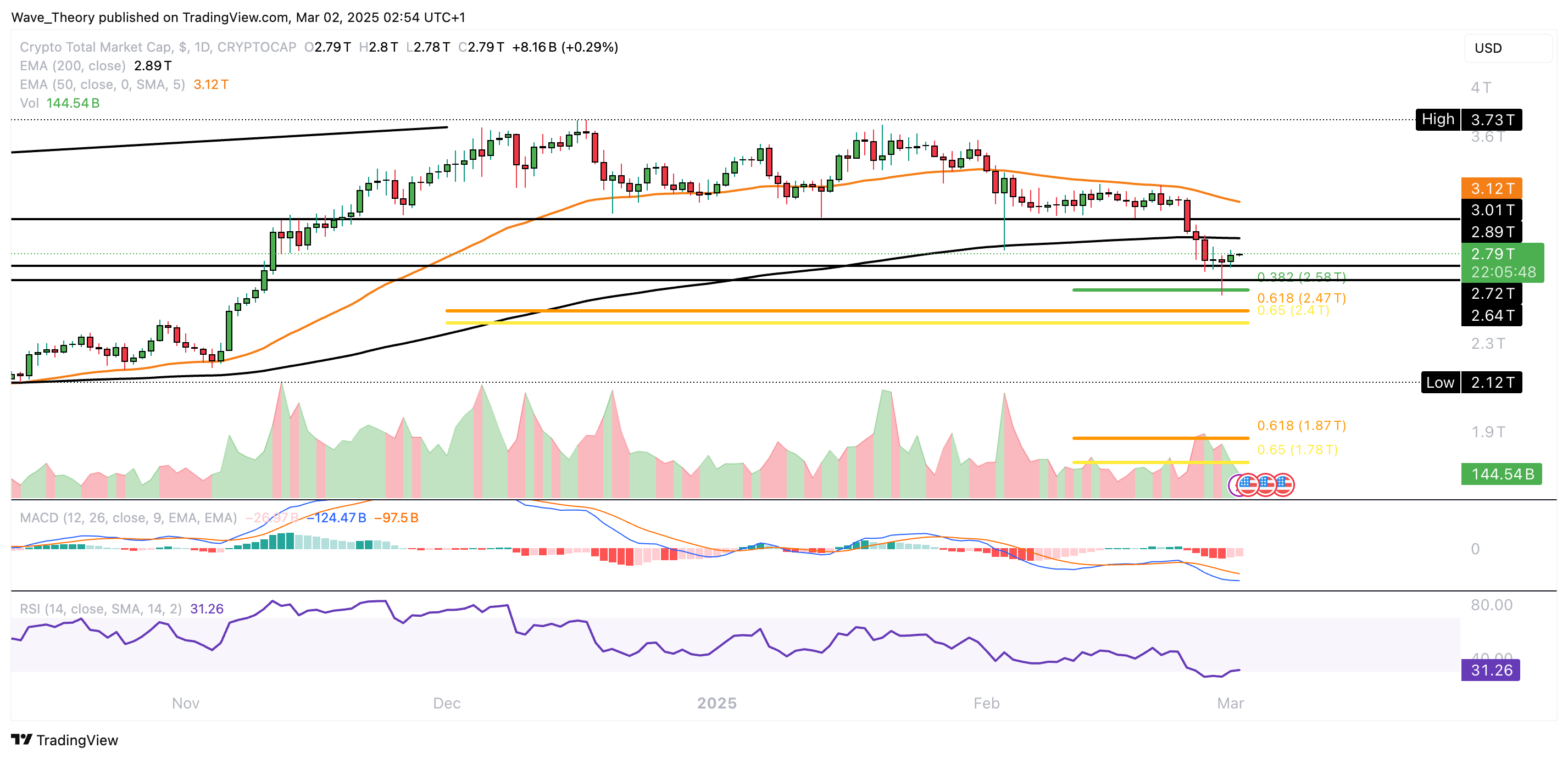 Sollte der Krypto-Markt die nächsten Fibonacci Unterstützungen zwischen rund 2,45 Billionen USD und 2,58 Billionen USD bärisch brechen, könnte der Markt zur Golden Ratio Unterstützung am 200-Wochen-EMA bei rund 1,75 Billionen USD zurückkehren.