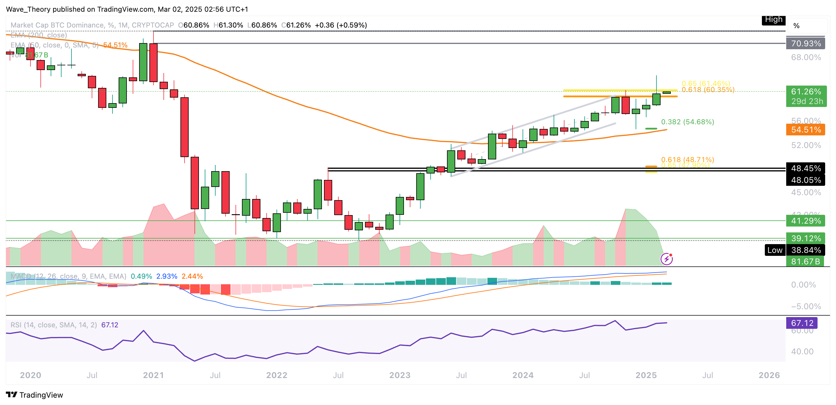 Die Bitcoin Dominanz wurde zunächst am Golden Ratio Widerstand bei rund 60,5 % bärisch abgewiesen, um zur 0,382 Fib Unterstützung bei rund 54,7 % zu korrigieren. Dort fungiert der 50-Monate-EMA als zusätzliche Unterstützung.