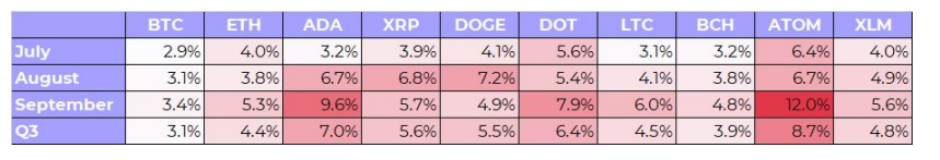 Im dritten Quartal hatten die meisten Kryptowährungen eine starke positive Korrelation. Vor allem ATOM zeigte aber eine niedrige Korrelation, gleichzeitig aber hohes Wachstum.