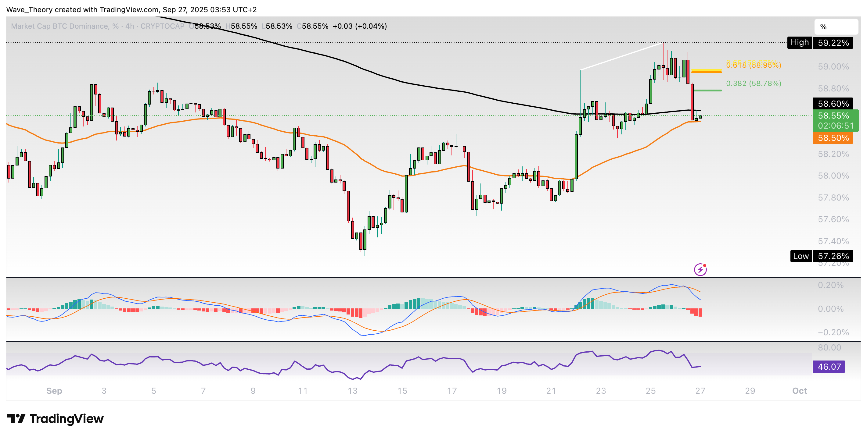 Die BTC Dominanz ist jetzt zum 50-4H-EMA bei rund 58,5 % korrigiert, woran der Kurs bullisch abzuprallen scheint. Die nächsten Fib Widerstände liegen dabei bei rund 58,8 % und 59 %.