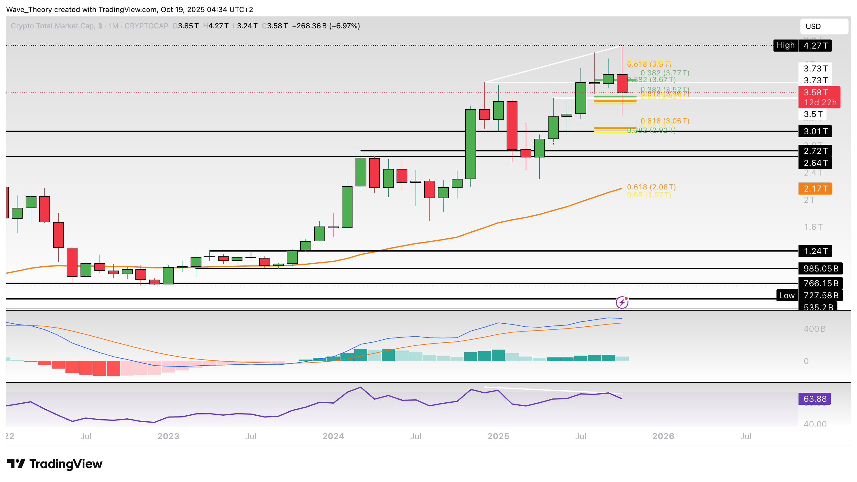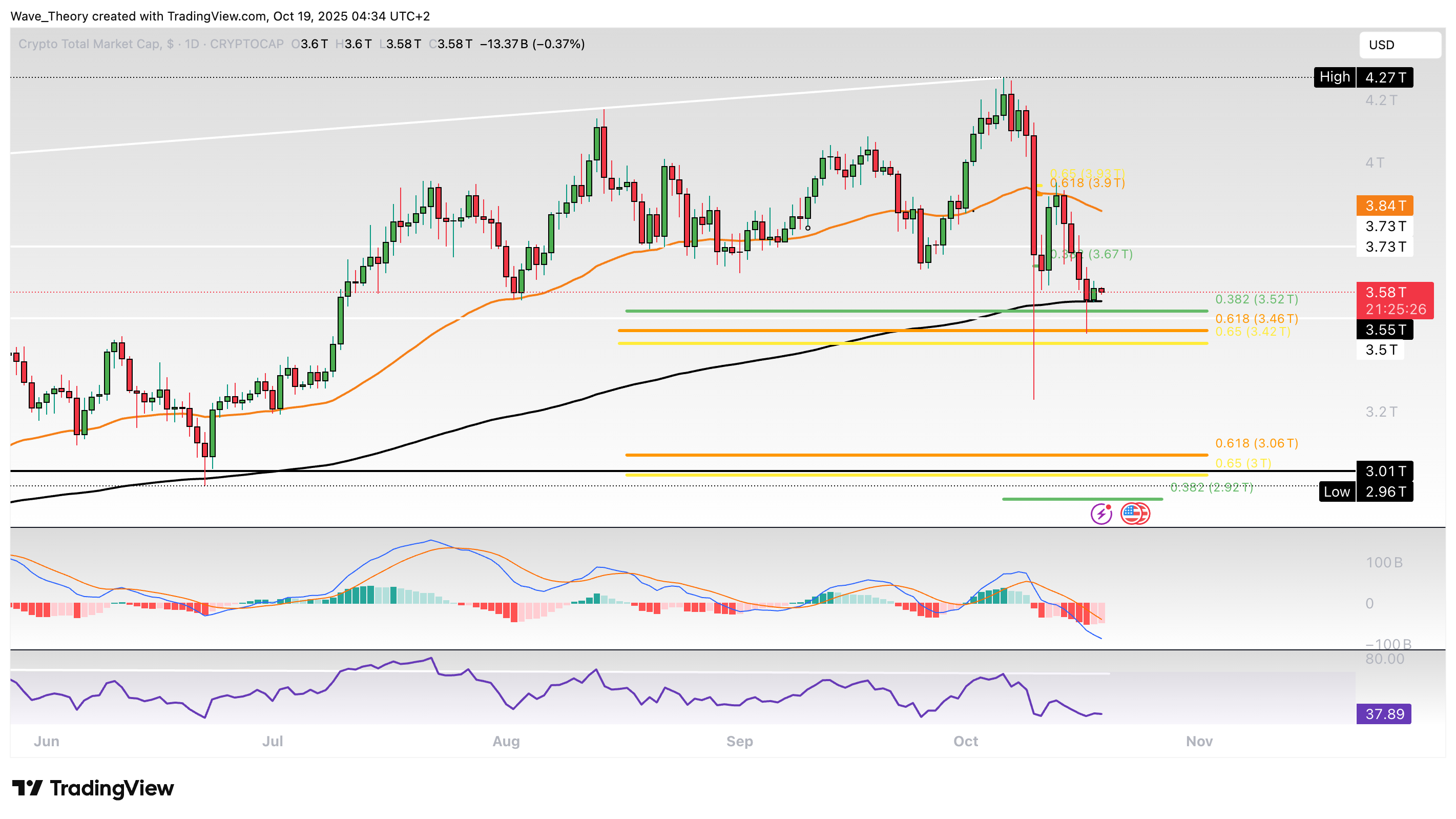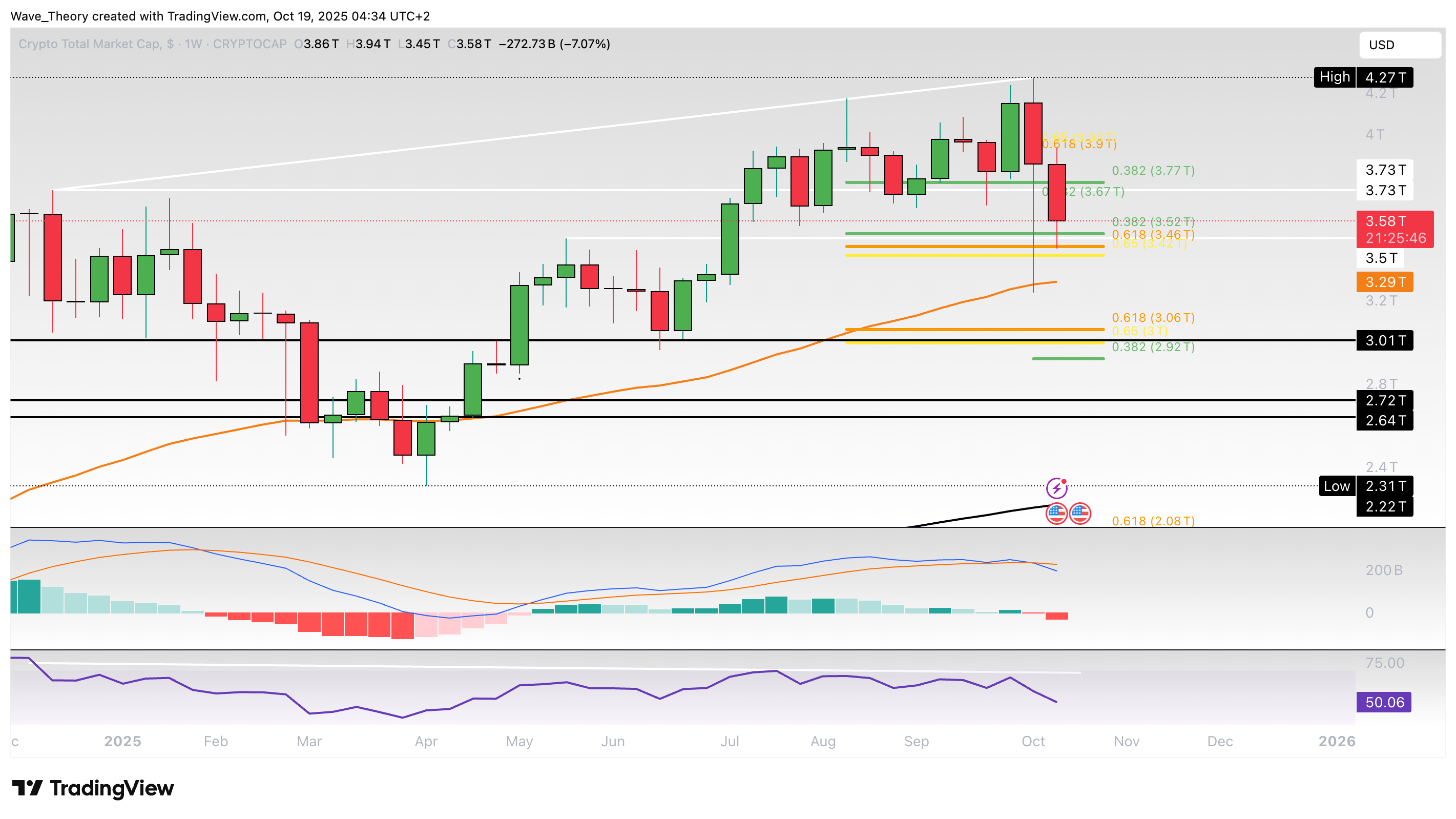Sollte der Markt die nächste Unterstützungszone zwischen rund 3,29 Billionen USD und 3,45 Billionen USD bärisch brechen, könnte der Markt auf eine Marktkapitalisierung von rund 2,92 Billionen bis rund 3,06 Billionen USD zurückkehren.