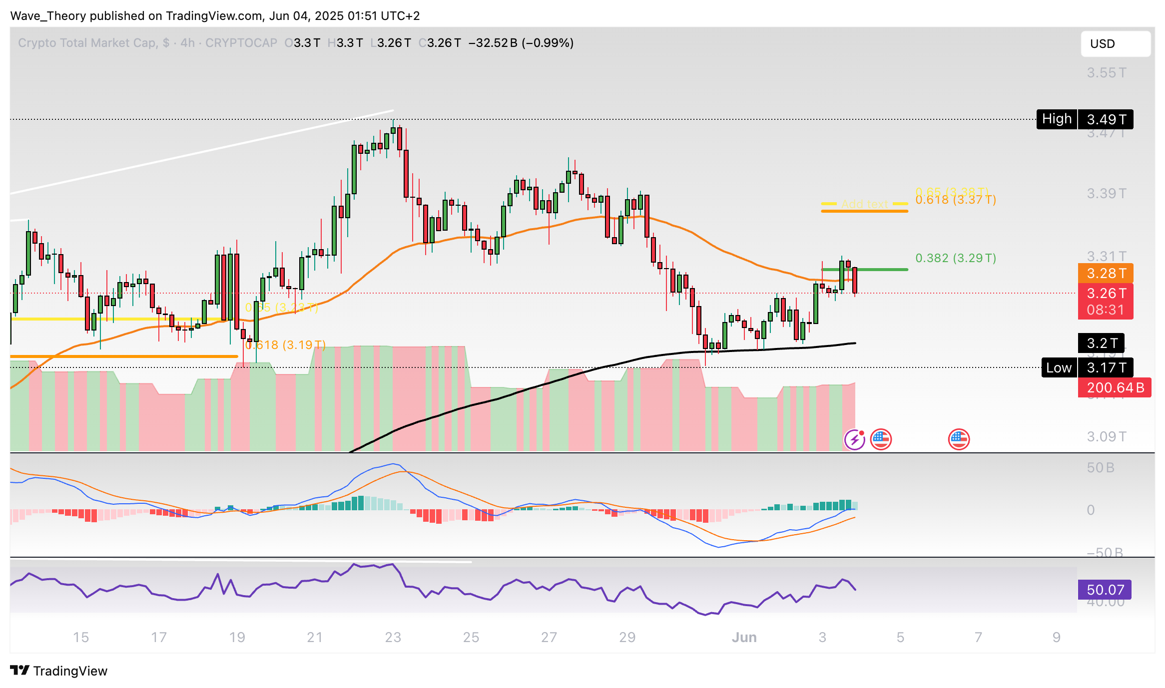 Jedoch wurde der Kurs jetzt am 0,382 Fib Niveau bei rund 3,29 Billionen USD bärisch abgewiesen. Um die neue Korrekturphase zu beenden, muss der Kurs die Golden Ratio bei rund 3,4 Billionen USD brechen.