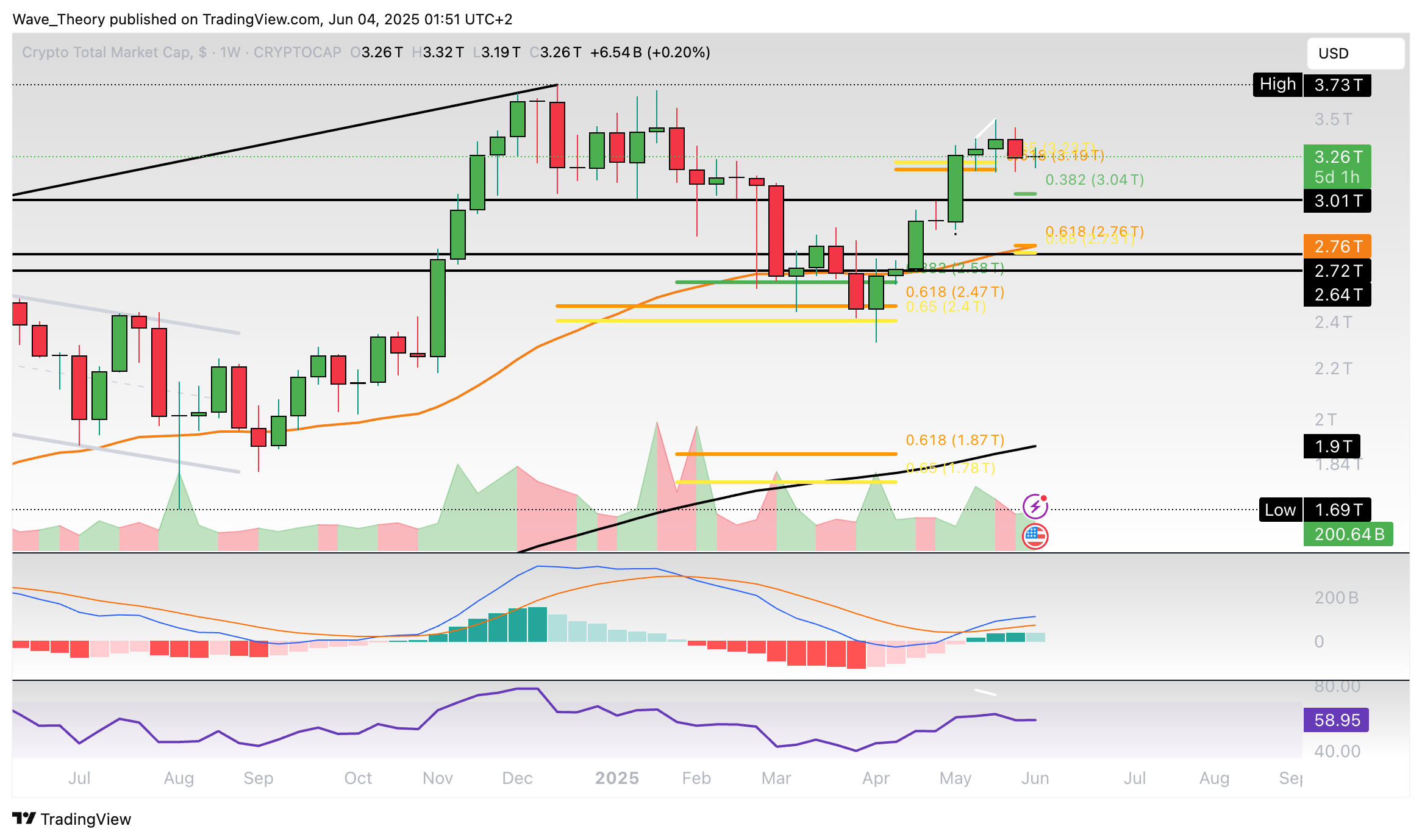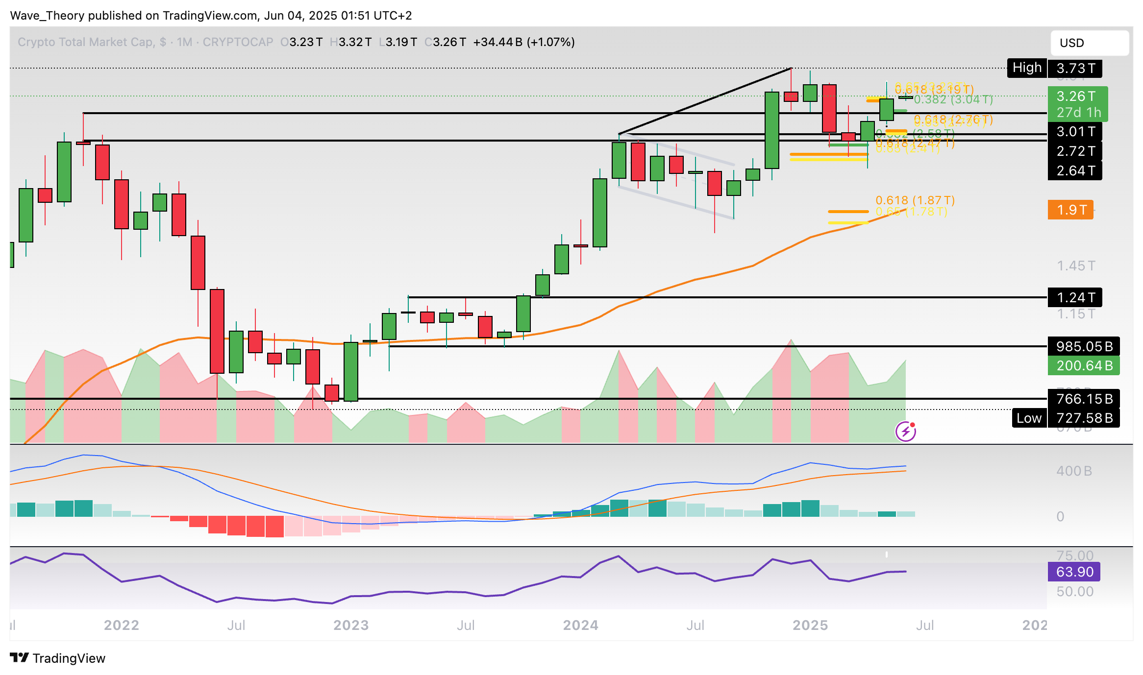 Sollte der Kurs stark korrigieren, wartet spätestens an der Golden Ratio am 50-Monate-EMA zwischen rund 1,85 Billionen USD 1,9 Billionen USD signifikante Fib Unterstützung.