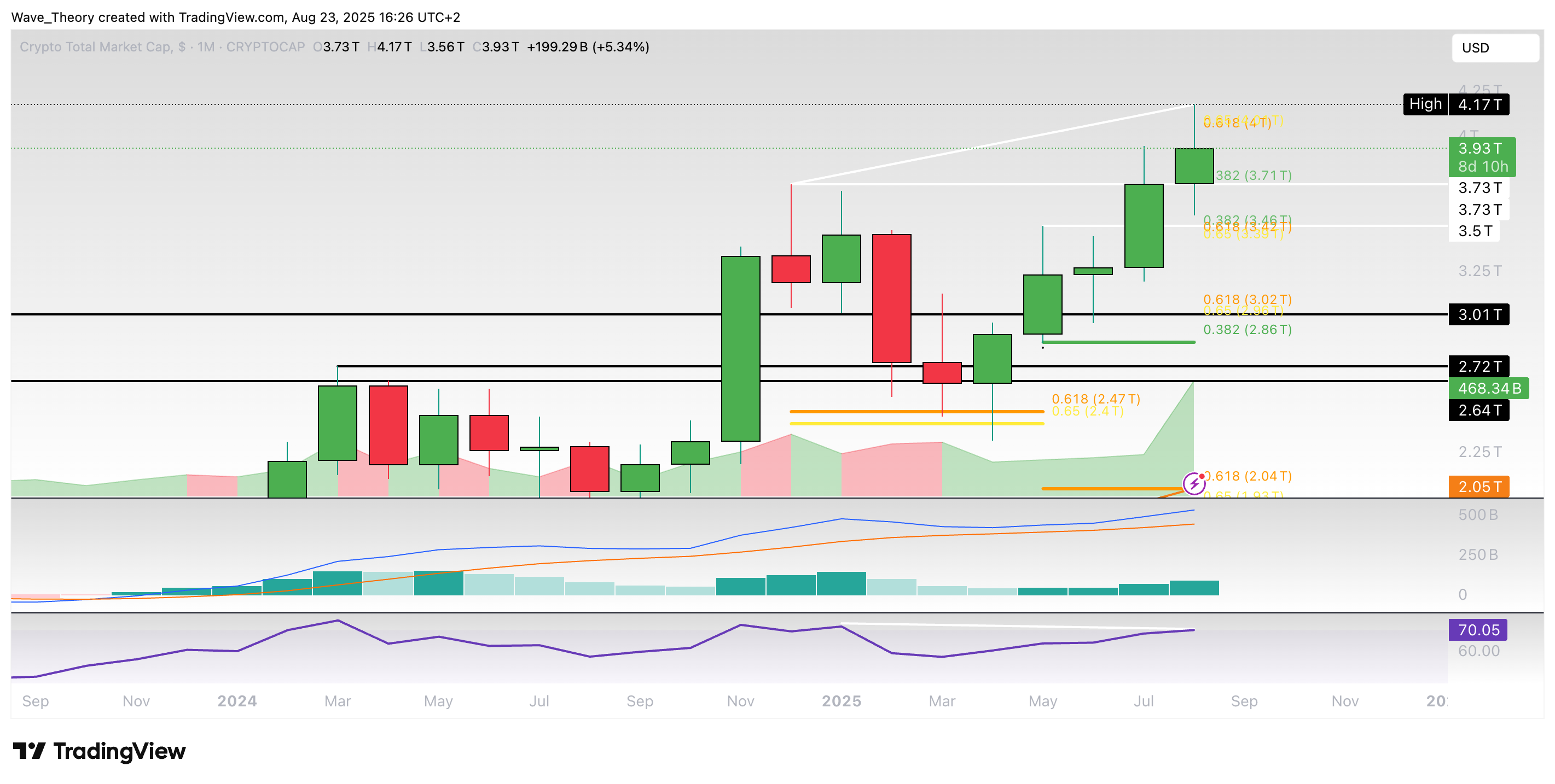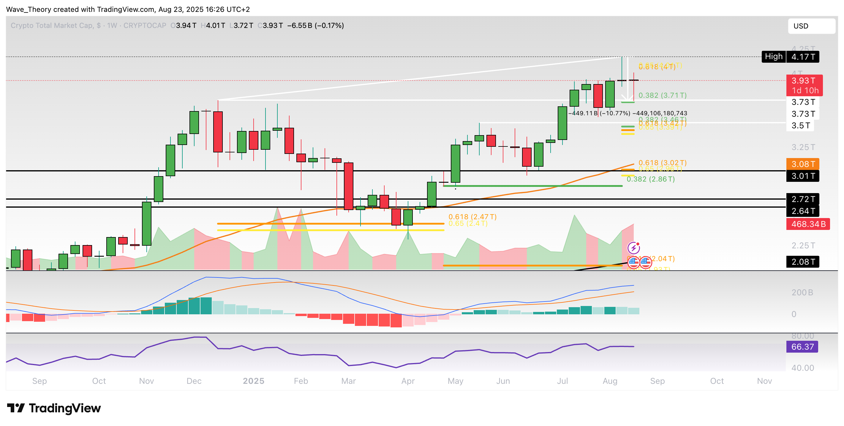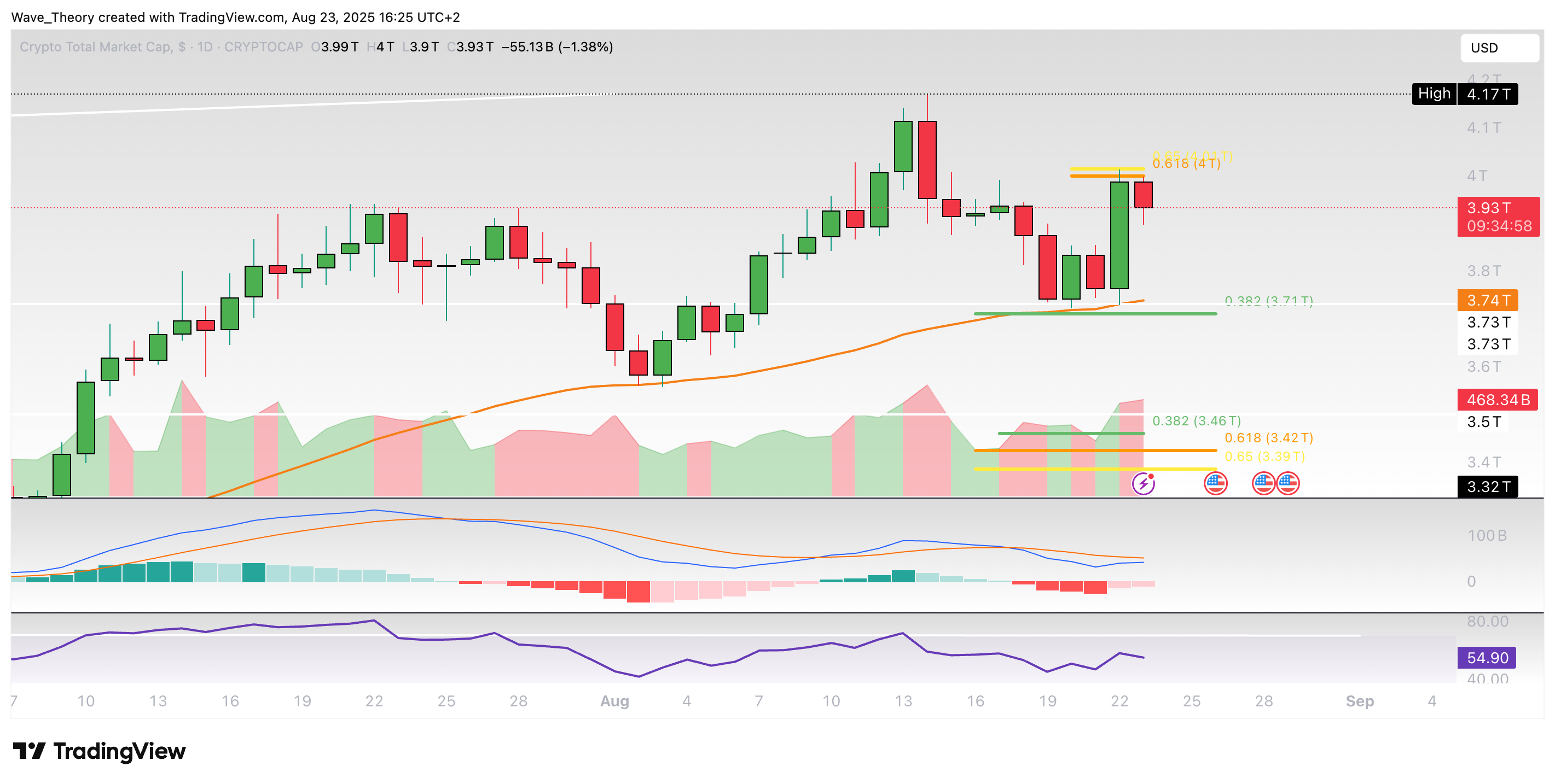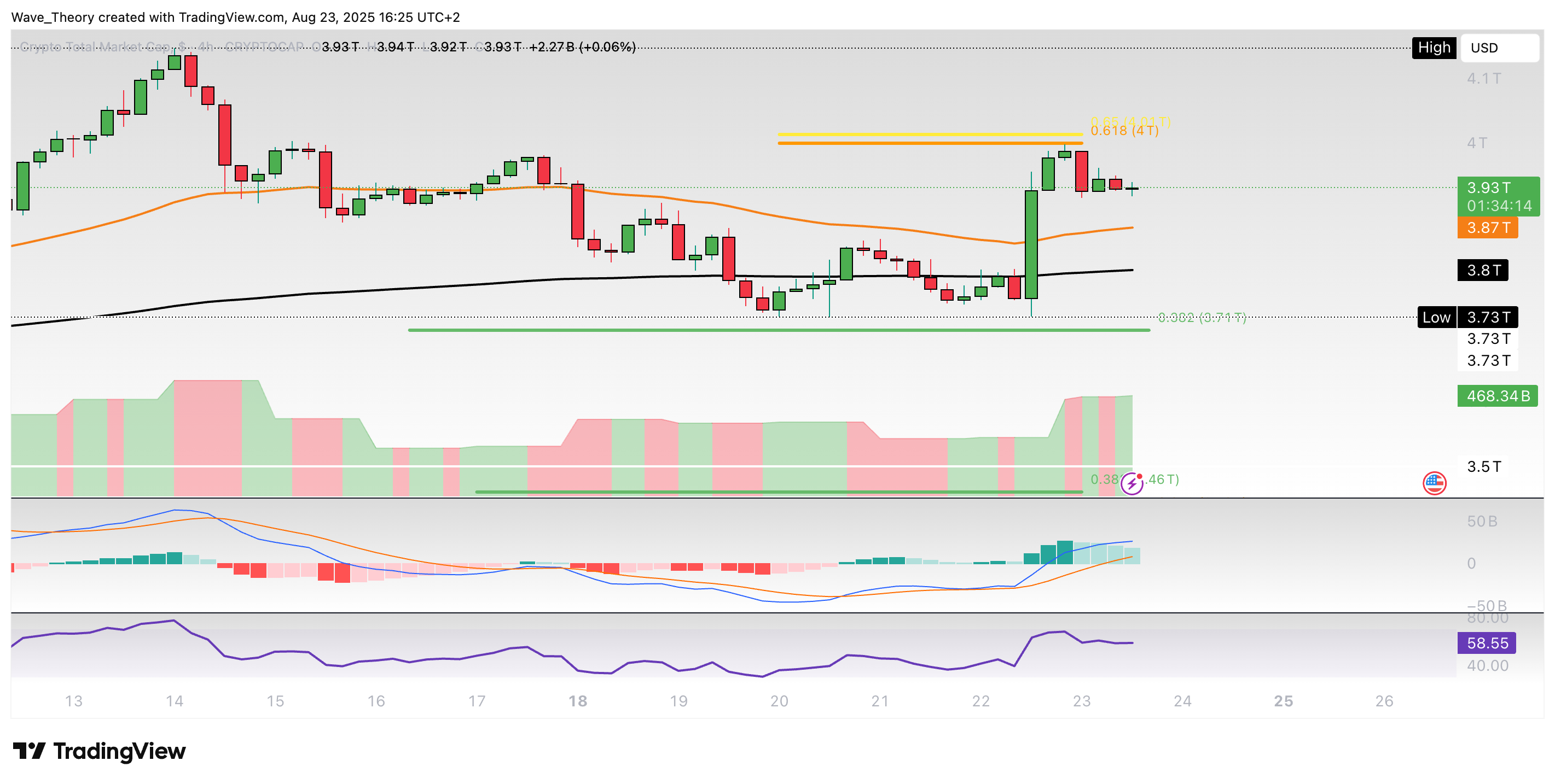 Der Markt ist vom Höhepunkt bei rund 4,17 Billionen USD zum 50-Tage-EMA bei rund 3,74 Billionen USD zurückgekehrt. Anschließend ist der Markt rund 7,6 % gestiegen, um das Golden Ratio Niveau bei rund 4 Billionen USD zu erreichen.
