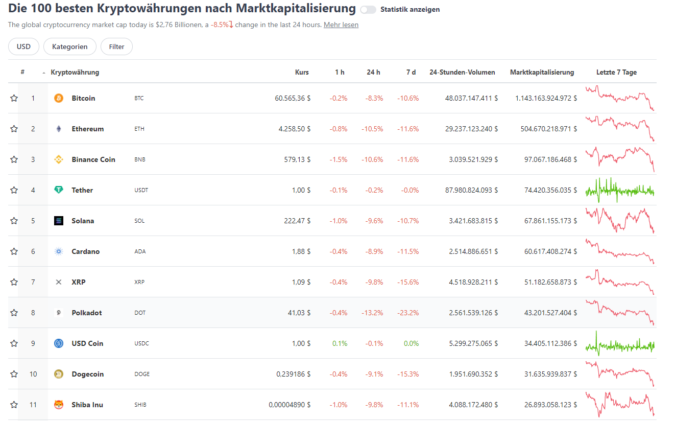 Laut Coingecko sind die Kurse fast aller Top 100 Krypto-Währungen wie z.B. der Cardano, Solana und auch Ethereum Kurs zusammen mit dem Bitcoin Kurs ca. 10% gefallen.
