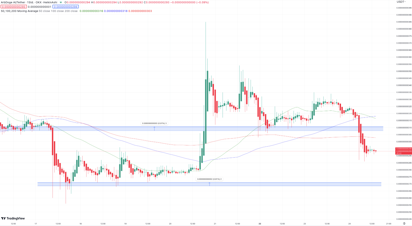 Anbei der Chart von ArbDoge AI. Im Stunden-Chart unterschritt der Kurs ein wichtiges Support-Level. Zugleich fiel ArbDoge AI unter den MA 200 und ein bearisches Crossover bildete sich ebenfalls.