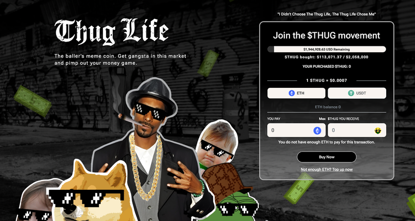 Sponsored SponsoredAuch ein Blick auf die Website von Thug Life ($THUG) verrät, dass die Chancen gut stehen, eine hohe Bewertung zu erzielen. Allein im Vorverkauf werden schon Token für 2 Millionen Dollar verkauft. Eine so hohe Marktkapitalisierung erreichen die meisten Meme-Coins nie und mit 2 Millionen Dollar scheint genau ein Wert gefunden zu sein, der eine gute Basis für einen anschließenden Kursanstieg darstellt.