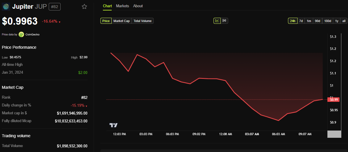 Laut BeInCrypto-Daten ist JUP seit der Montags-Session um fast 17% gefallen. Zum Zeitpunkt des Schreibens wurde er bei 0,9963 USD gehandelt.