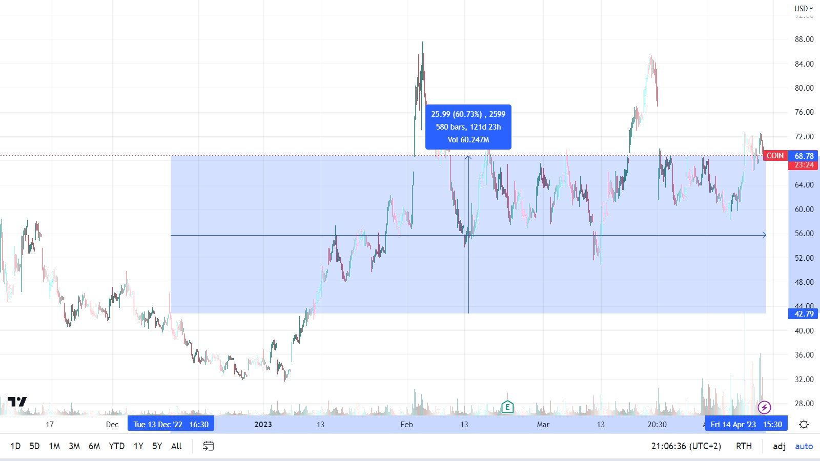 Auch mit einem seiner letzten Statements über die Coinbase-Aktie traf er wieder erschreckend genau den letzten Tiefpunkt. Am 13. Dezember 2023 twitterte er: