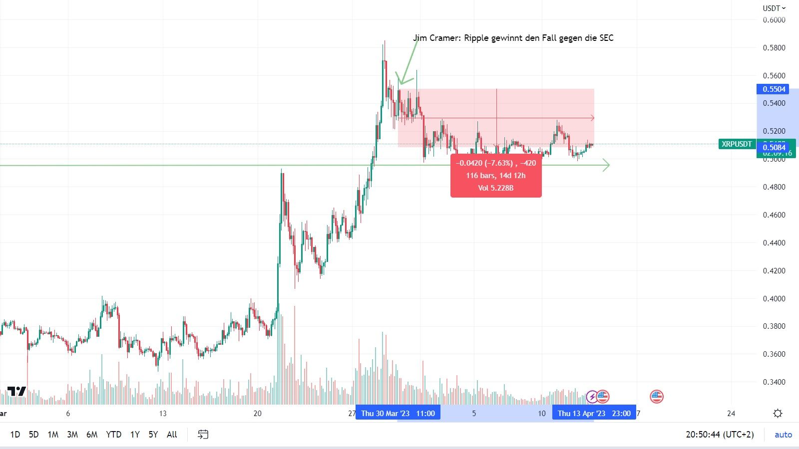 Cramer prognostizierte dabei bis auf wenige Stunden exakt den letzten lokalen Hochpunkt des XRP Kurses. Seitdem ist der Preis um rund 7 % gefallen.