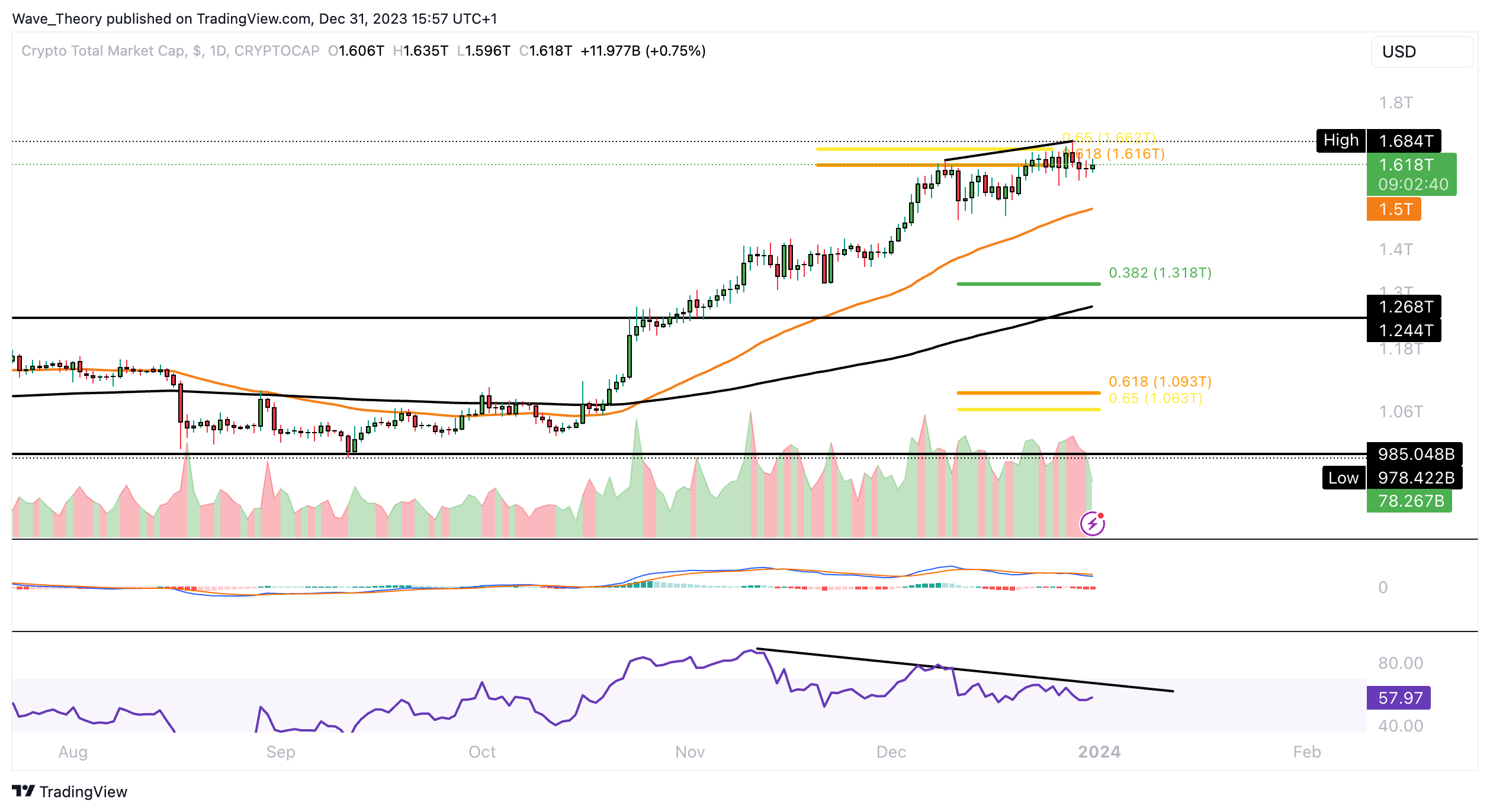 Der RSI weist hingegen in überkauften Regionen eine bärische Divergenz auf, woraufhin der Kurs eine Korrektur einleiten könnte. Krypto findet dann bei rund 1,32 Billionen USD und 1,1 Billionen USD die nächsten signifikanten Fib Unterstützungen.