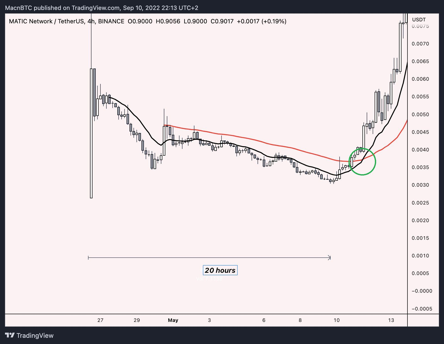 Beides war bei MATIC zu beobachten. Nach der Börsennotierung fiel die Kryptowährung für einen Zeitraum von etwa 20 Stunden. Als der kurz- (rote) und langfristige (schwarze) MA eine bullische Überkreuzung bildeten (grün markiert), begann der Kurs massiv zu steigen.