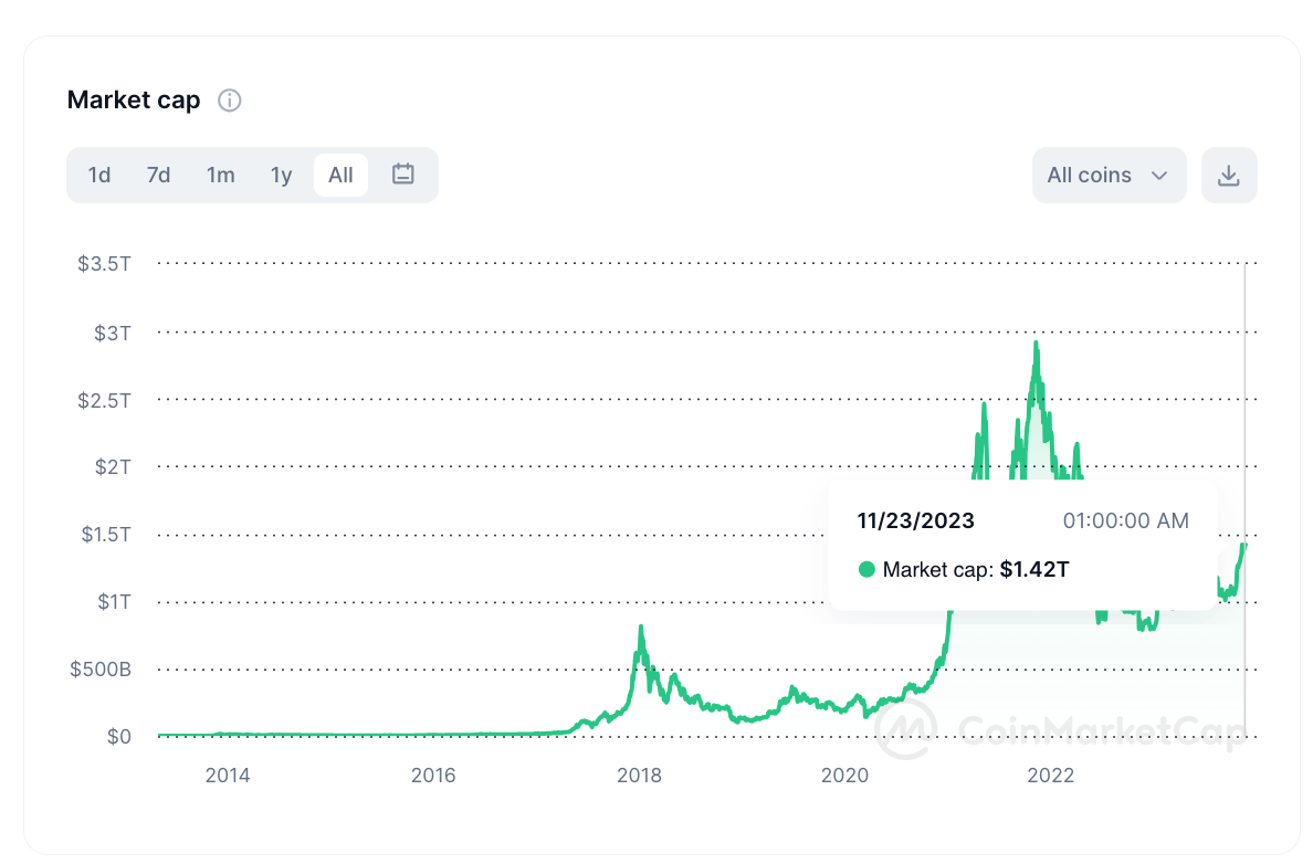 Die Märkte konnten sich weitgehend von den turbulenten Ereignissen dieser Woche erholen. Trotz der Vorstöße der US-Regulierungsbehörden übertrafen viele Kryptowährungen kürzlich sogar ihre Höchstwerte von Mai 2022. Auch die Gesamtmarktkapitalisierung scheint ihren Aufwärtstrend fortzusetzen und befindet sich aktuell bei etwa 1,42 Billionen USD.