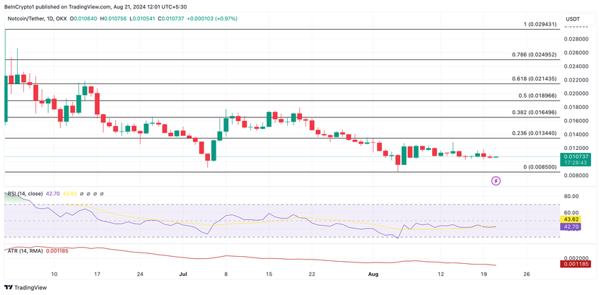 Darüber hinaus ist der Average True Range (ATR) von NOT, der die Marktvolatilität misst, seit dem 8. August rückläufig, was die Konsolidierungsphase unterstreicht. Eine sinkende ATR weist auf eine geringere Marktvolatilität hin, was bedeutet, dass der Vermögenswert weniger anfällig für Kursschwankungen ist. Aktuell liegt die ATR von NOT bei 0,0011.