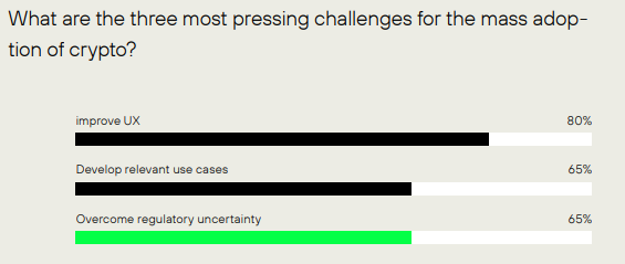 Die Ergebnisse sprechen für sich. Bei der offenen Frage – ohne die Vorgabe von Antwortmöglichkeiten – nannten 70 % der Gründer die Präzisierung der Krypto-Regulierung. Dabei ist anzumerken, dass Europa mit der MiCA-Regulierung einen großen Schritt in die richtige Richtung gemacht hat, der auch den Gründer:innen nicht entgangen zu sein scheint.