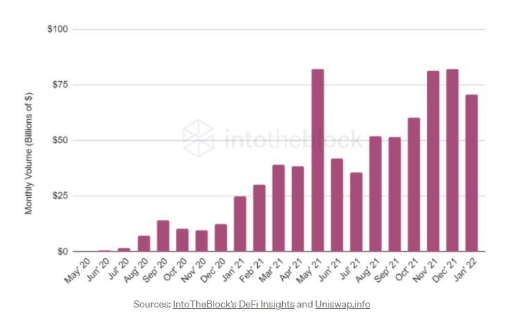 In der Grafik zu sehen ist der rasante Anstieg des Handelsvolumens auf Uniswap. 75 Milliarden US-Dollar stellen den Höchstwert dar. Interessanterweise scheint der Trend trotz schwachem Markt nicht abzureißen. Im Dezember wurde der Rekord-Einstand zum Monat Mai erreicht. Im Mai war allerdings die Marktkapitalisierung wesentlich höher als im Dezember. Das bedeutet, dass immer mehr User die Plattform nutzen.