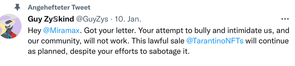Und da sind wir nun im Januar 2022, Tarantino bleibt bei seinem Vorhaben, die NFTs zu veröffentlichen und Miramax verschärft seine Wortwahl gegenüber Guy Zyskind und Secret Labs: „Unabhängig von den begrenzten Rechten, die Herr Tarantino auf die Veröffentlichung von Drehbüchern hat, erlauben sie nicht die Herstellung einzigartiger NFTs, die mit dem geistigen Eigentum von Miramax verbunden sind, und seine gegenteilige Position ist Gegenstand eines anhängigen Rechtsstreits”, heißt es in der E-Mail von Proskauer Rose LLP weiter. “Was Sie in Ihrer Pressemitteilung als “nie zuvor gesehenes handgeschriebenes Drehbuch” von Herrn Tarantino bezeichnen, kann noch nicht “ikonisch” oder ein “Fan-Favorit” sein, sodass es offensichtlich ist, dass Sie und Herr Tarantino versuchen, aus Miramax’ Inhalten, geistigen Eigentumsrechten und der Marke Kapital zu schlagen.”