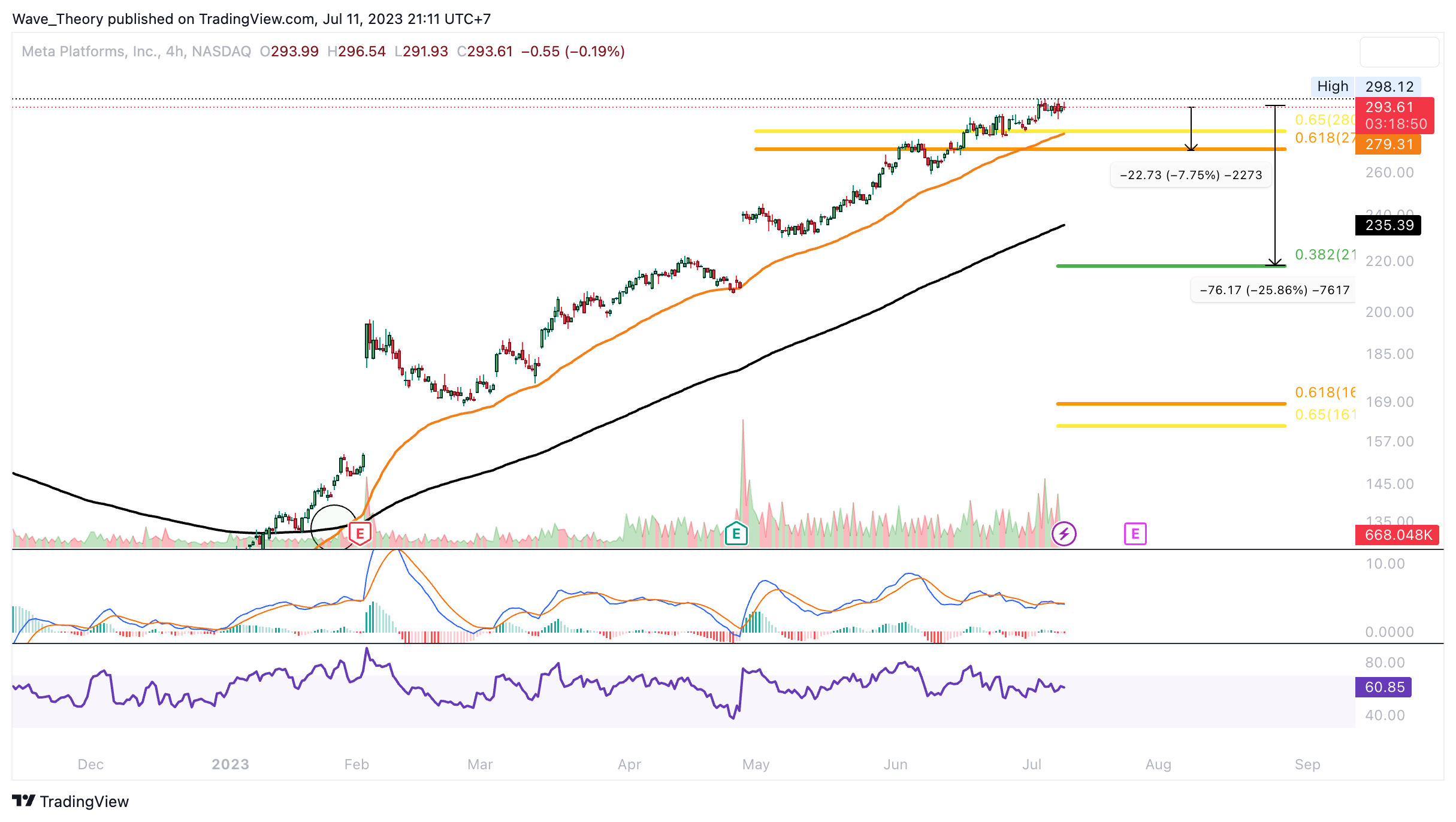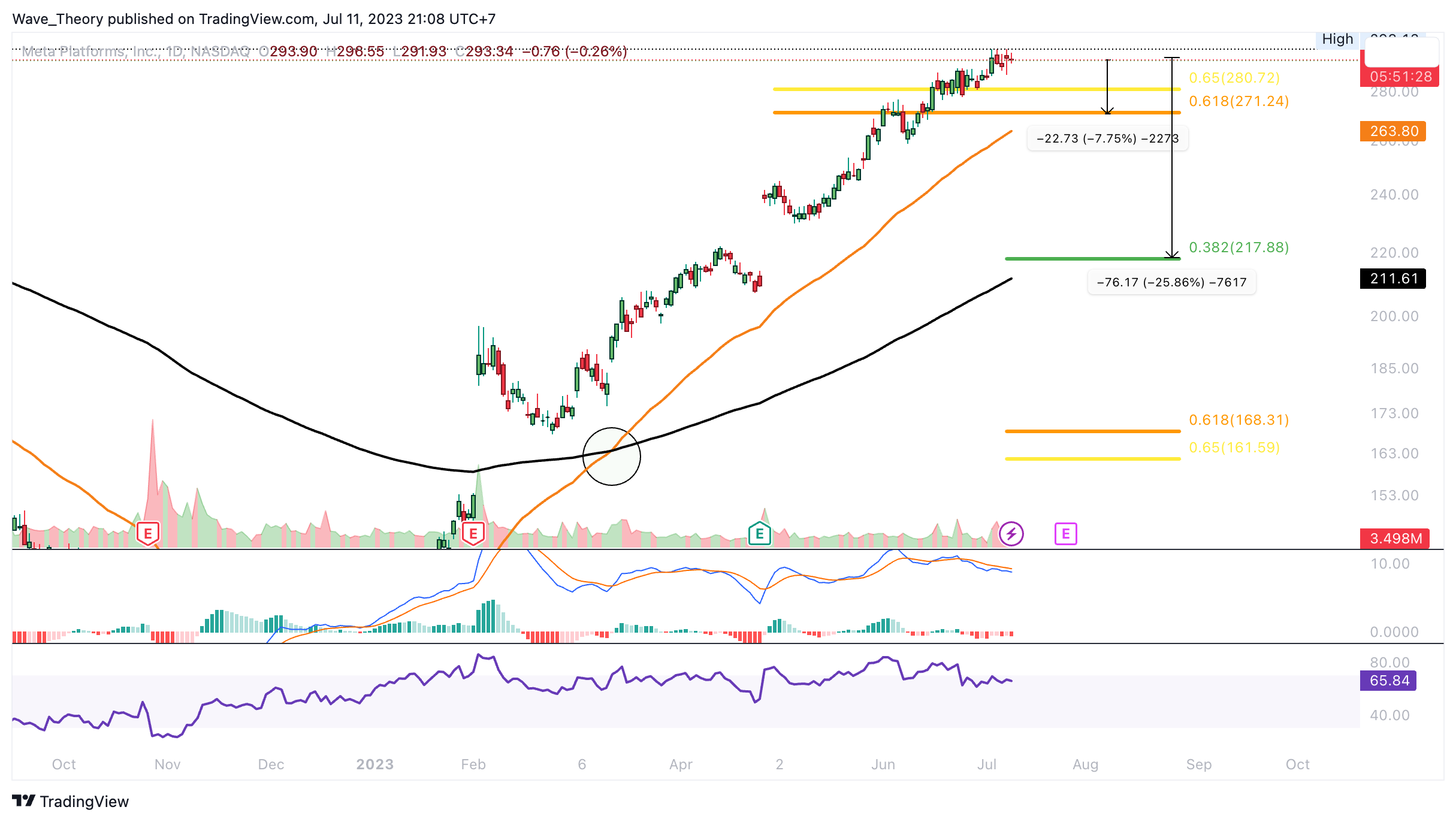 Im Idealfall bestätigt META die Golden Ratio bei rund 280 USD jetzt als Unterstützung. Das impliziert ein Abwärtspotenzial von knapp 8 %. Andernfalls könnte der META Kurs zu den nächsten Fib Unterstützungen bei rund 218 USD respektive 165 USD korrigieren. Das impliziert ein Abwärtspotenzial von mindestens 26 %.