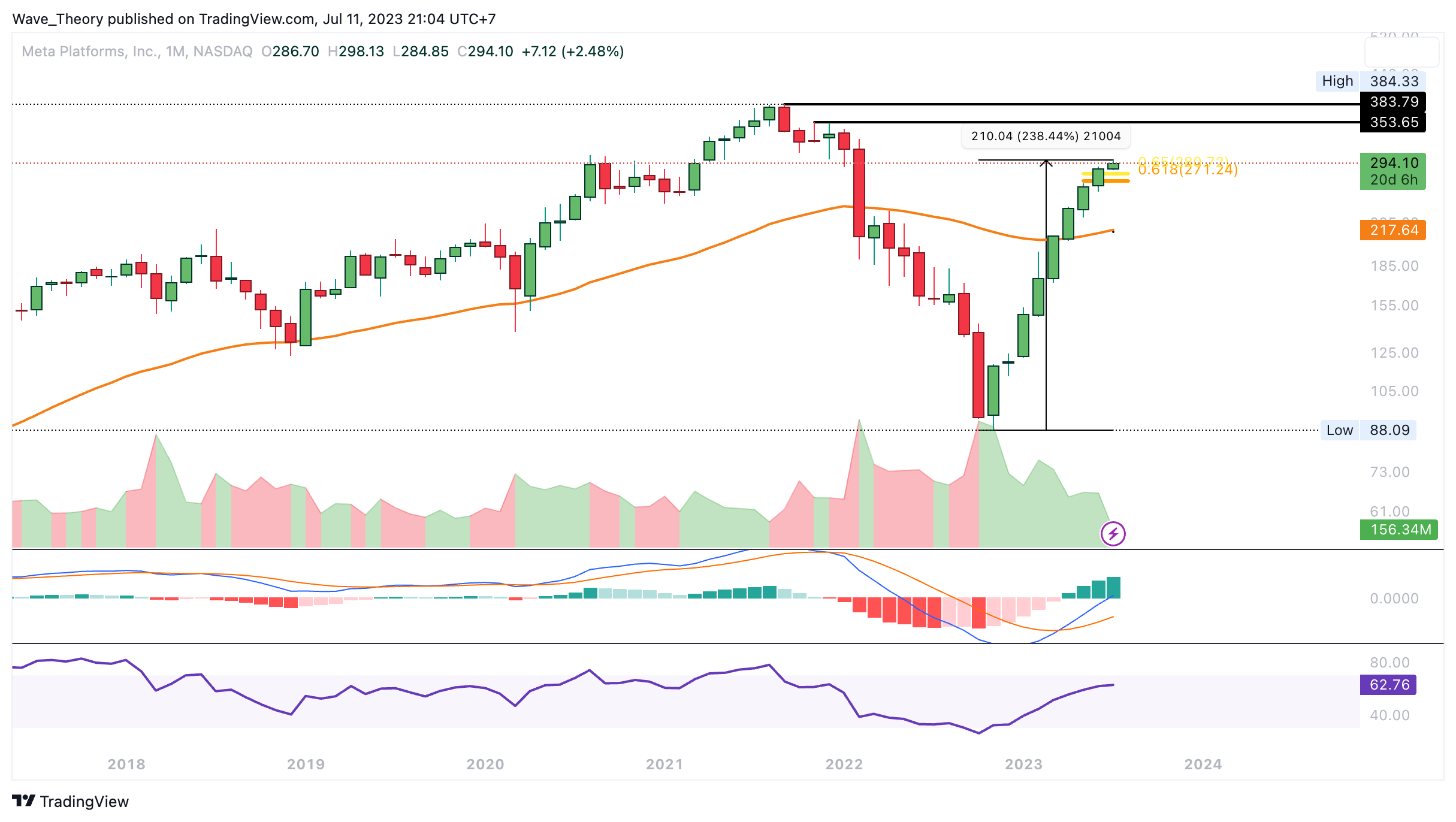 Die META Aktie konnte den Golden Ratio Widerstand bei rund 280 USD überwinden, womit sich der META Kurs wieder im Bullenzyklus befindet. Damit könnte META schon bald das ATH bei rund 384 USD anvisieren. Zwischen rund 353 USD und 384 USD wartet der nächste signifikante Widerstand auf den META Kurs.