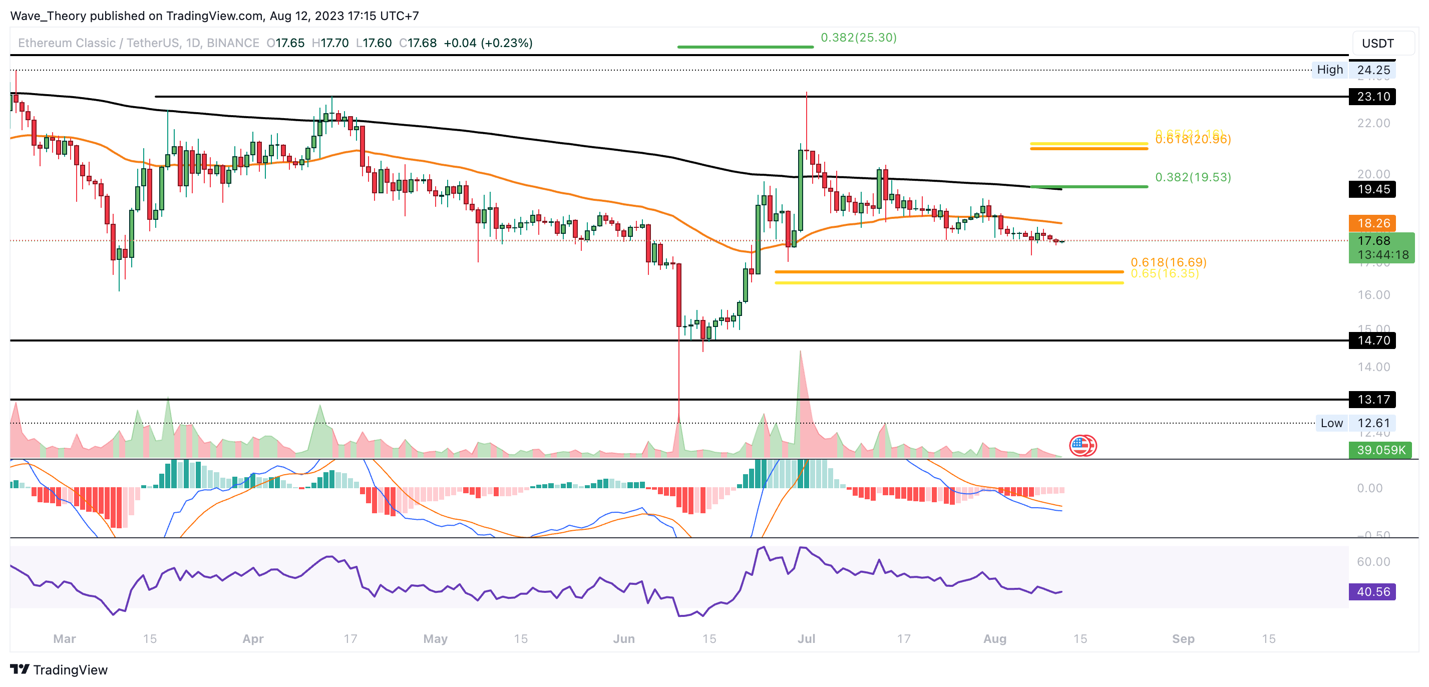 Der Ethereum Classic Kurs hat die 50-Tage-EMA Unterstützung bärisch gebrochen und könnte damit zur Golden Ratio bei rund 16,5 USD korrigieren.
