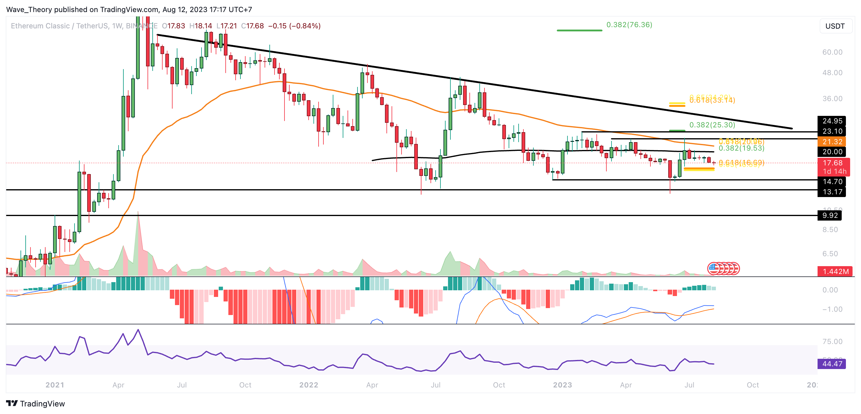 Sollte die Golden Ratio Unterstützung bei rund 16,5 USD nicht halten, wartet zwischen rund 13,2 USD und 14,7 USD die nächste signifikante Unterstützung.