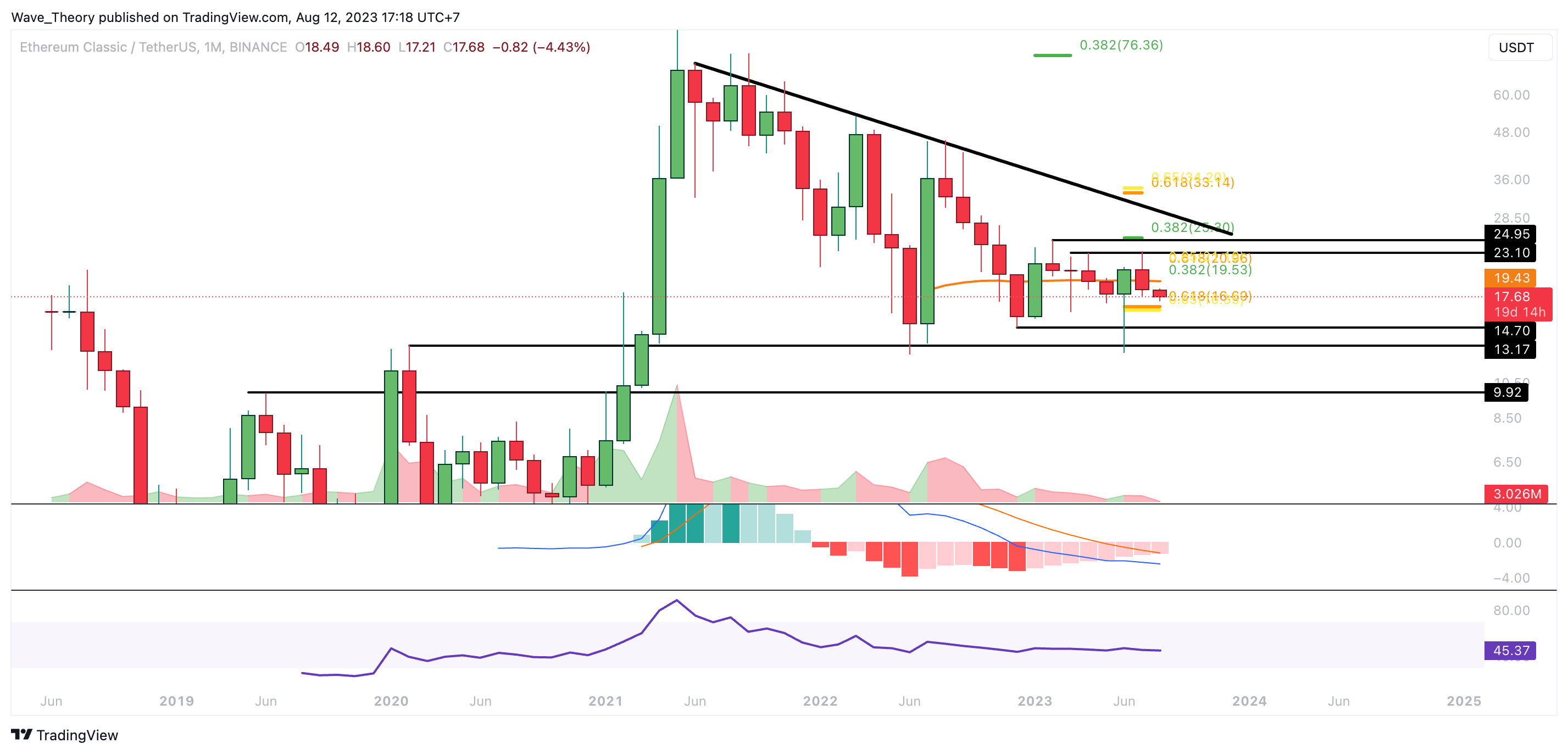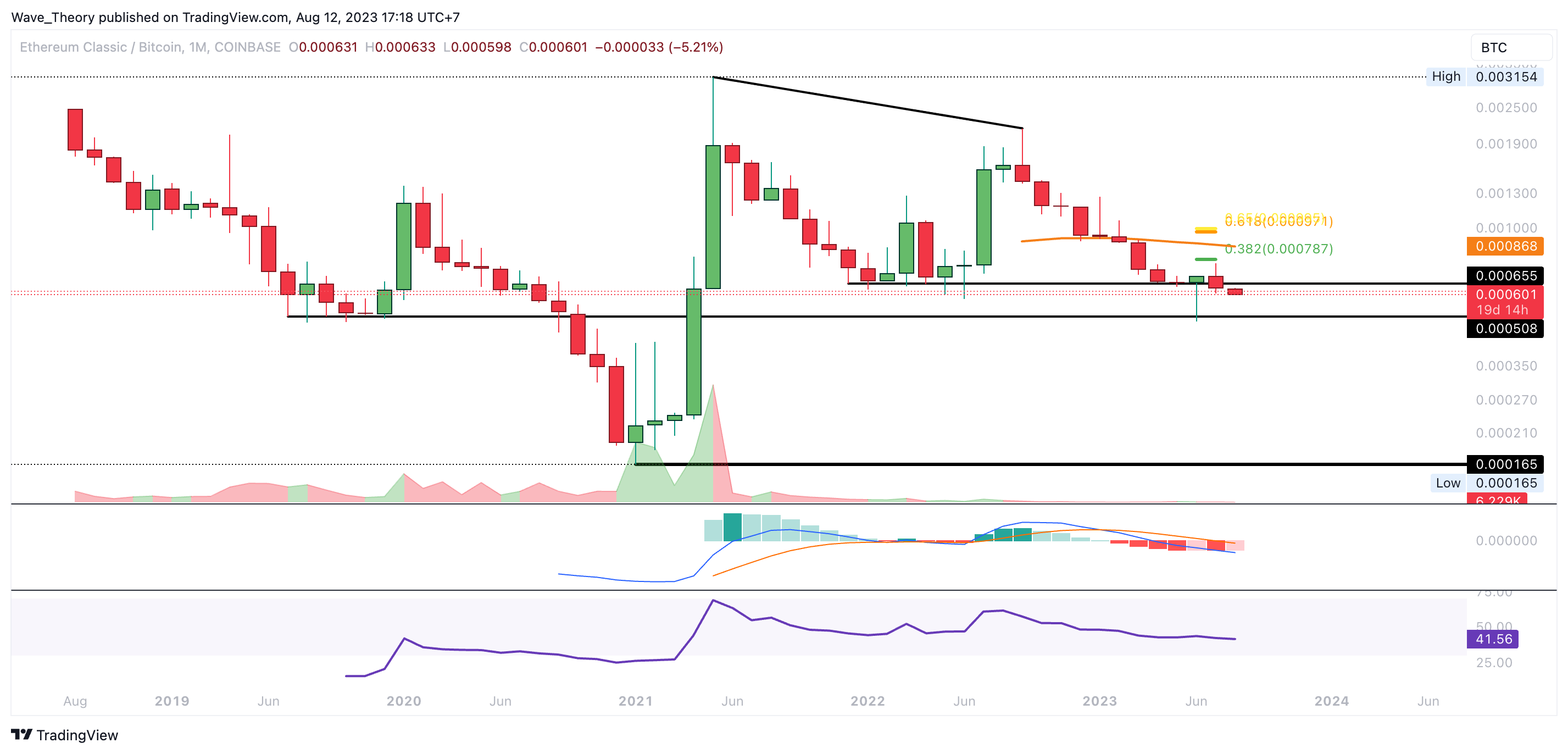 Gegen BTC befindet sich der ETC Kurs zurück in der Unterstützungszone zwischen rund 0,000508 BTC und 0,000655 BTC, woran der Kurs vorletzten Monat bullisch abprallen konnte. Den 0,382 Fib Widerstand bei rund 0,000787 BTC konnte der Kurs dabei aber nicht brechen, womit sich der Ethereum Classic Kurs nach wie vor in einer Abwärtsbewegung findet.