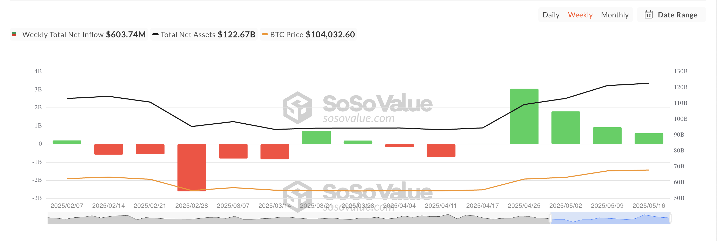 Zwischen dem 12. Mai und dem 16. Mai beliefen sich die Bitcoin Spot ETF-Zuflüsse auf 603,74 Mio. USD. Obwohl dies ein Netto-Plus in Bezug auf die Zuflüsse in diese Fonds darstellte, war die Zahl der letzten Woche der niedrigste wöchentliche Zufluss im vergangenen Monat. Dies unterstreicht eine vorsichtigere, aber anhaltende Kapitalbewegung in den Markt.