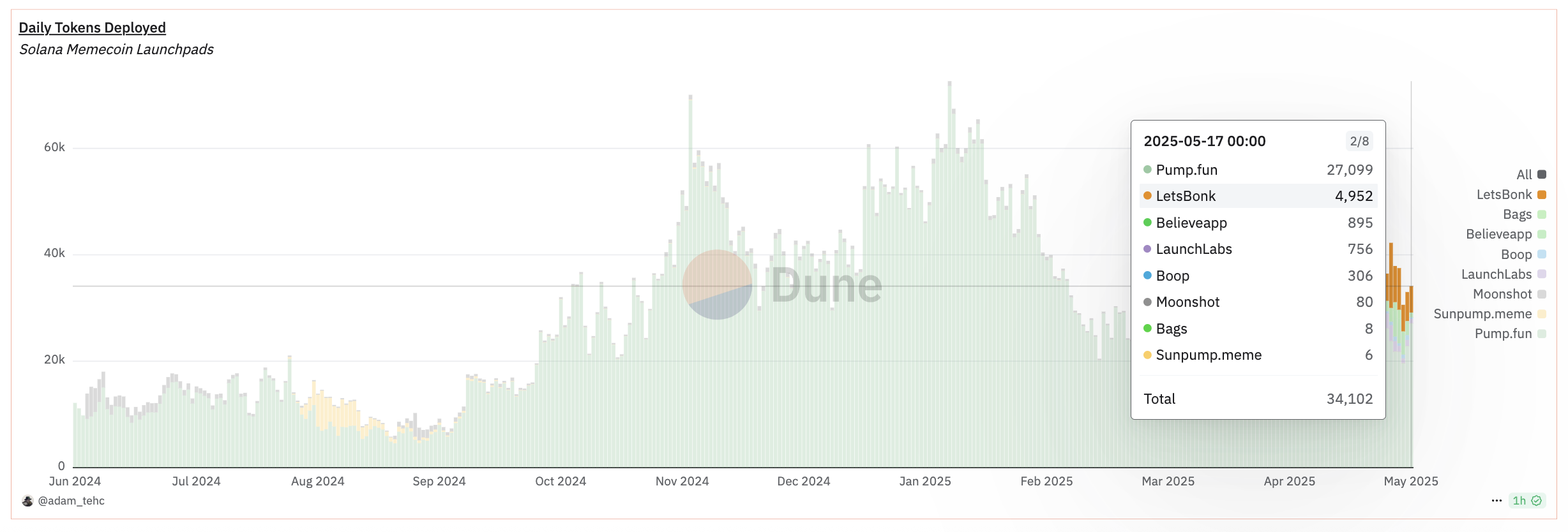 Seitdem hat sich das Tempo jedoch deutlich verlangsamt – am 16. Mai wurden nur noch rund 2.600 neue Token eingeführt, am 17. Mai waren es nur noch 895. Dieser Rückgang deutet darauf hin, dass sich der anfängliche Hype um die Krypto-Plattform zumindest kurzfristig abkühlt.
